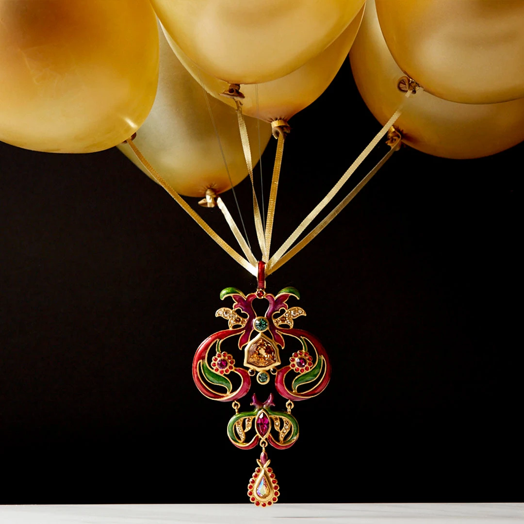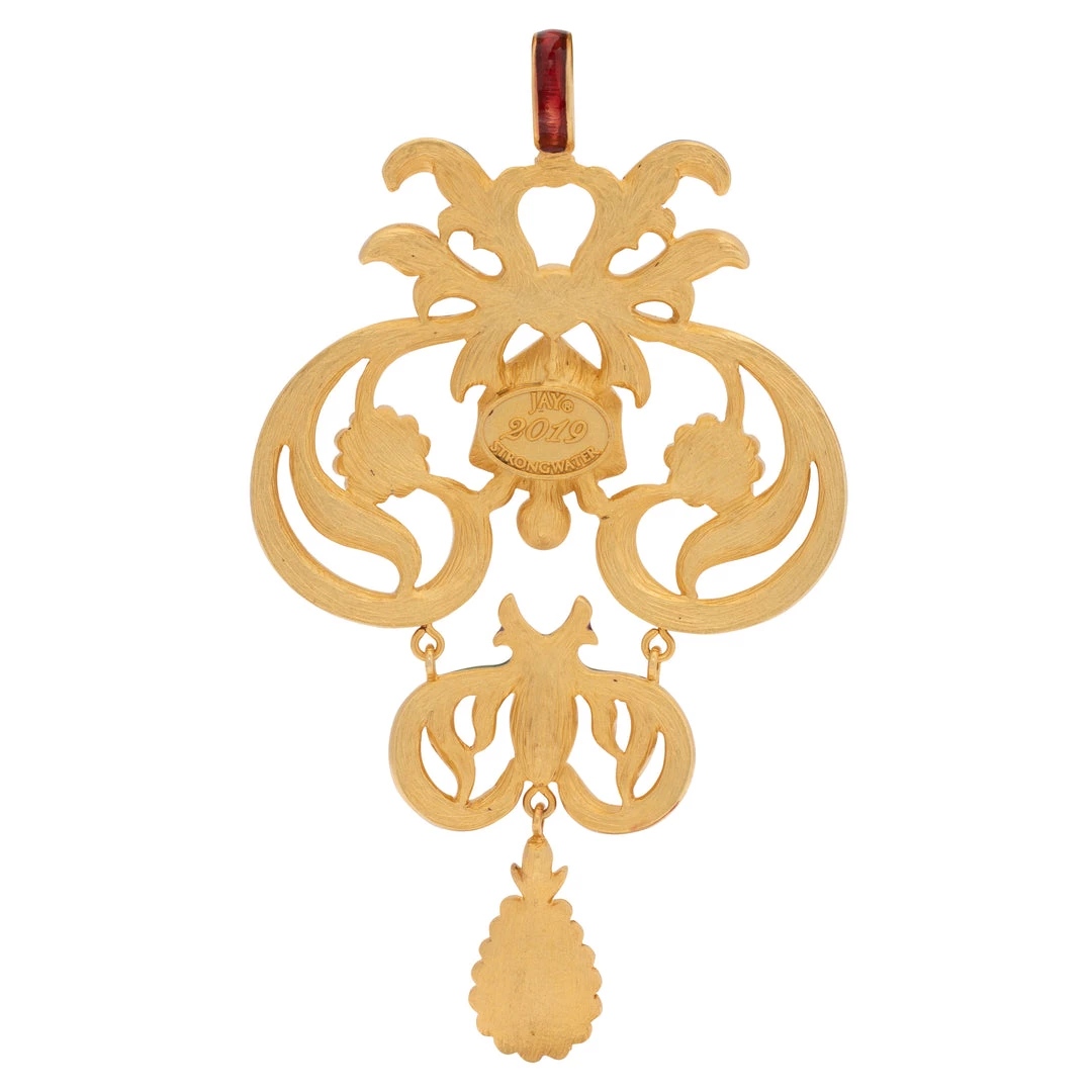 Our heritage of creating only one jeweled metal holiday ornament each year continues with our 2019 Annual Ornament. Ruby, emerald and fuchsia polished enameled scrolls surround an impressive Swarovski® faceted trillion cut crystal stone in champagne topaz, surrounded by siam and emerald colored crystals with a glorious dangling faceted pear cut crystal stone in aurora topaz. Carved in pewter, finished in 14K gold and inscribed with 2019 on the back. Flawless craftsmanship from our Rhode Island artisans – to be shared with generations to come. When not adorning your tree consider adorning yourself by simply tying this jewel pendant from a ribbon!