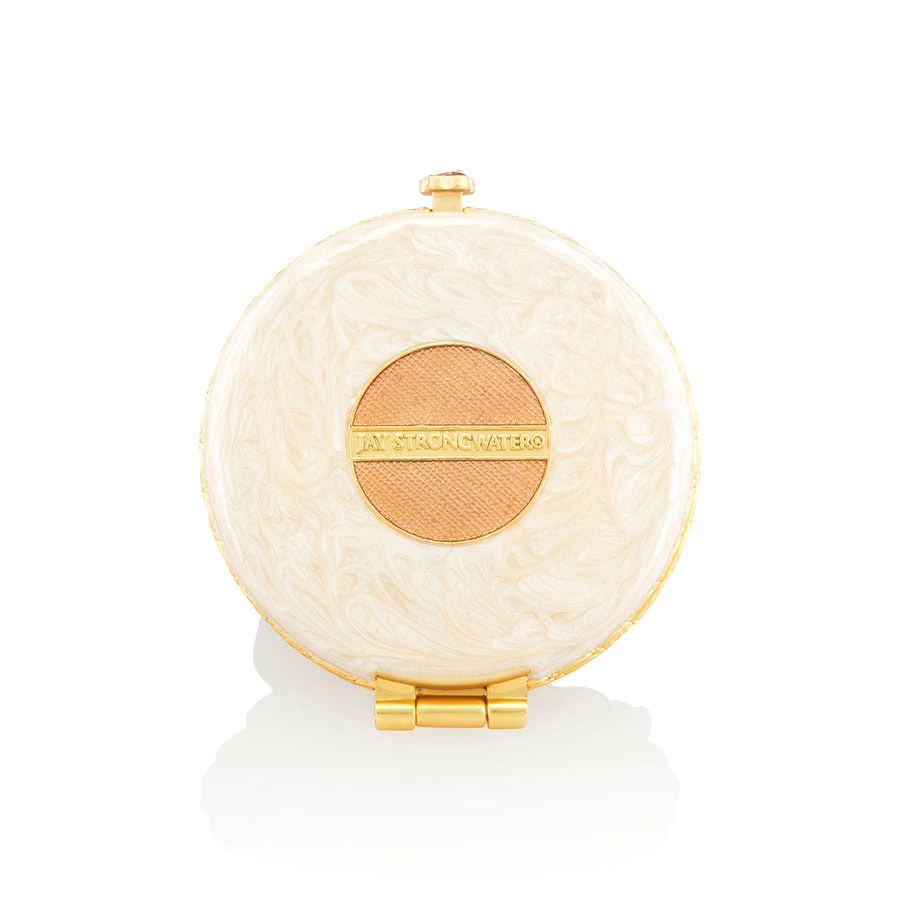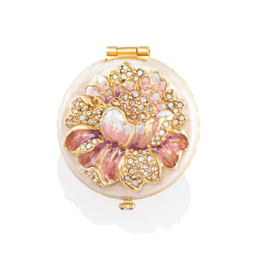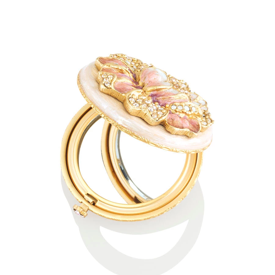 Pewter flower with a 18K gold finish, hand-enameled and hand-set with Swarovski® crystals. Gold finished brass compact with a regular and a magnifying mirror inside and signature flower closure.