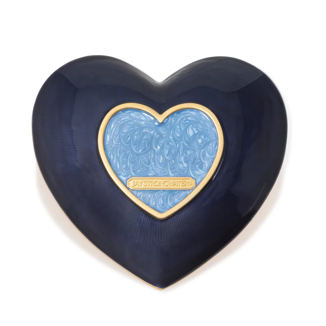 A field of delicate fern leaves and flowers etched on our romantic Aria Floral Heart Trinket Tray in the always compelling blue & white colorway. Watercolor shades of hand-painted cobalt enamels highlight the flora set on a creamy white background on this pewter tray finished in 18K gold – the underside finished in translucent navy enamel. Hand-set with Swarovski® White Opal and Sapphire crystals.