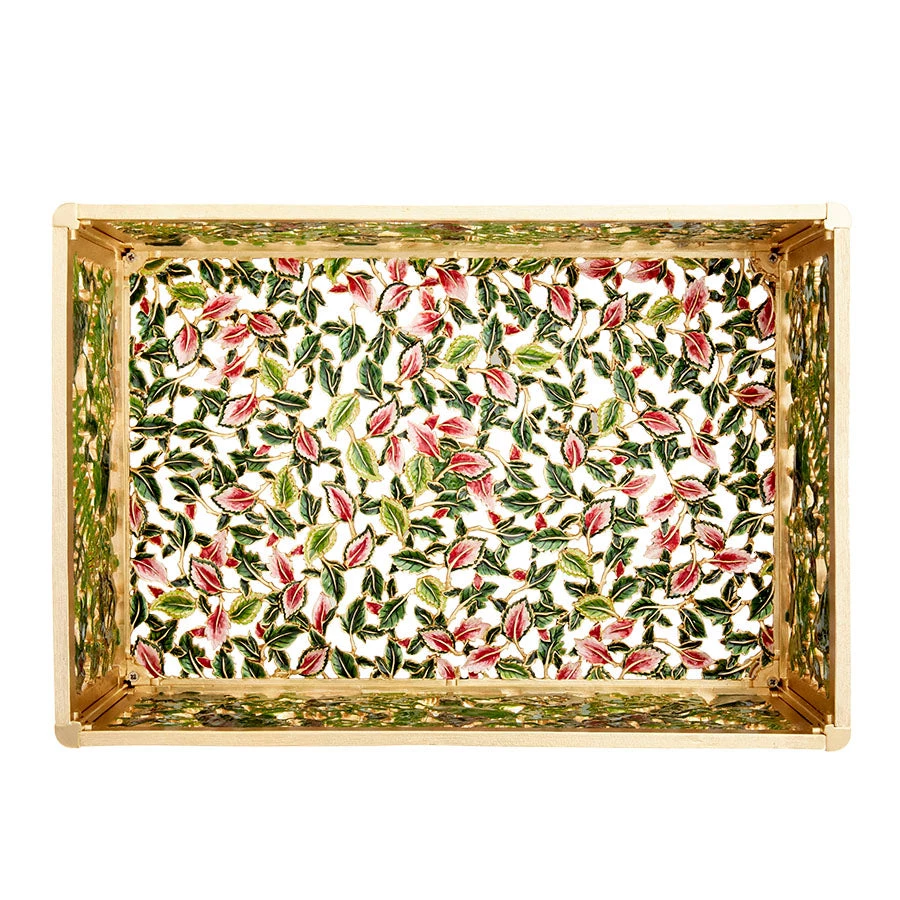 A lush, fully dimensional, vibrant rose bouquet blooms on the lid of the Laura Grand Rose Box while each side is a pattern of pierced exotic leaves. Romantic shades of enamel bring out the beauty in each petal, leaf, and butterfly with over fifteen hundred sparkling hand-set Swarovski® crystals. Our finest artisans at the Jay Strongwater Rhode Island workshop bring all the elements together to make each box.