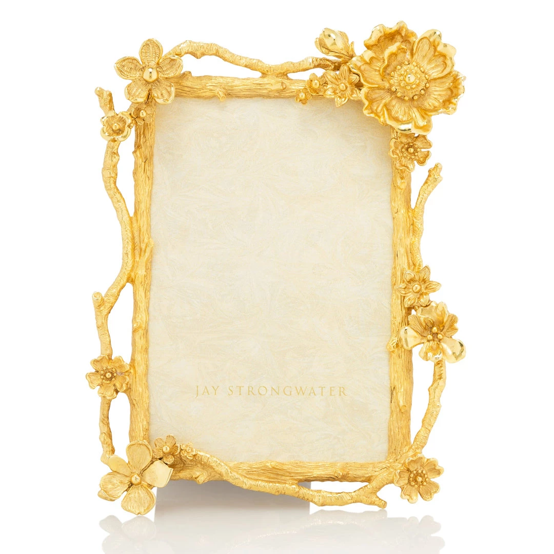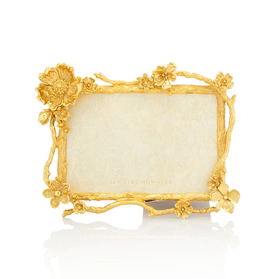 In the Composition collection, we set aside our enamels and crystals allowing the natural beauty of the carved metals to shine through. A graceful composition of metal twigs and floral blossoms surround the Breanna frame in delicate beauty. Casted in pewter and hand-polished with a 18K gold finish by our master artisans in Rhode Island. This Breanna frame is complete with a mahogany finished wood back plate and kick stand allowing it to stand vertically or horizontally.