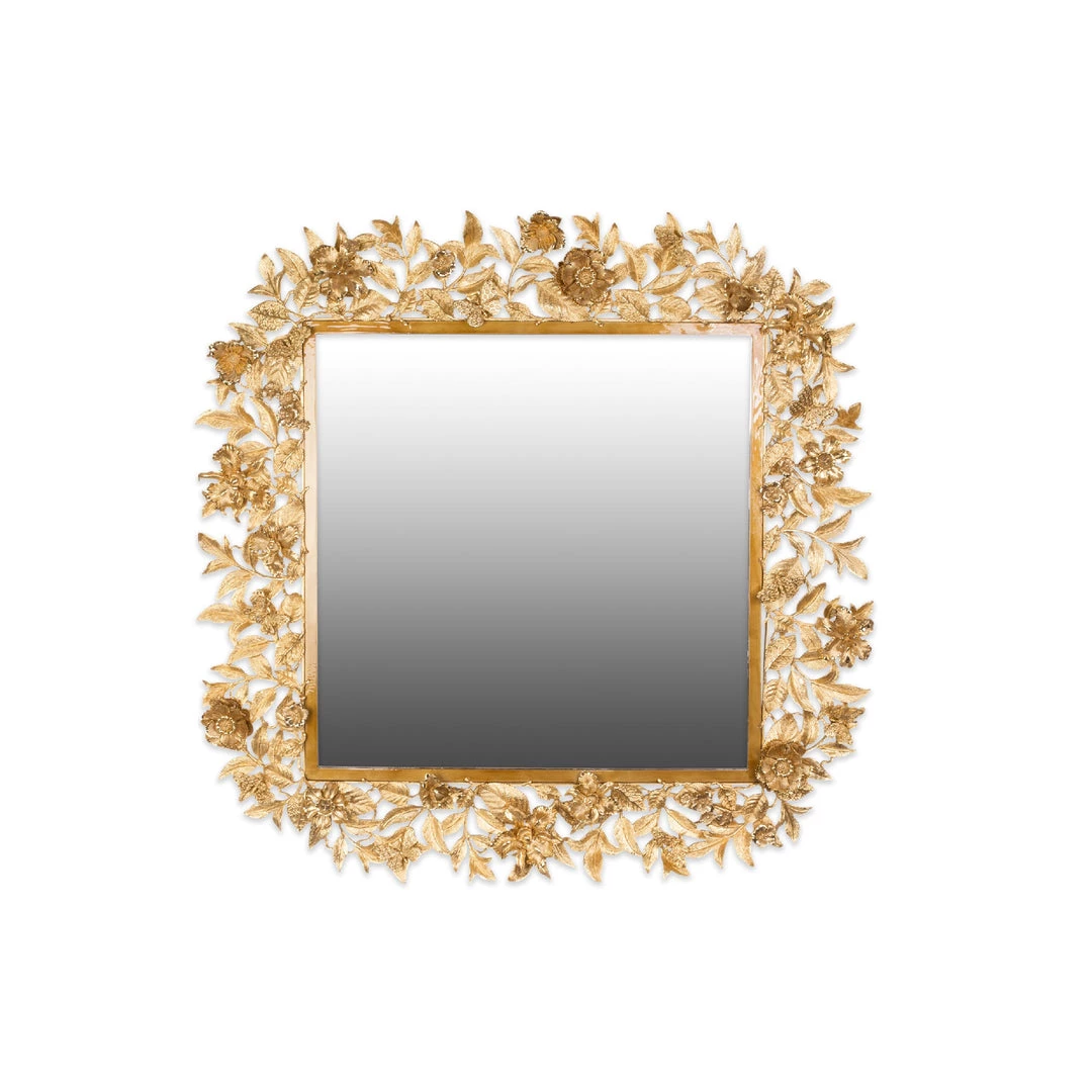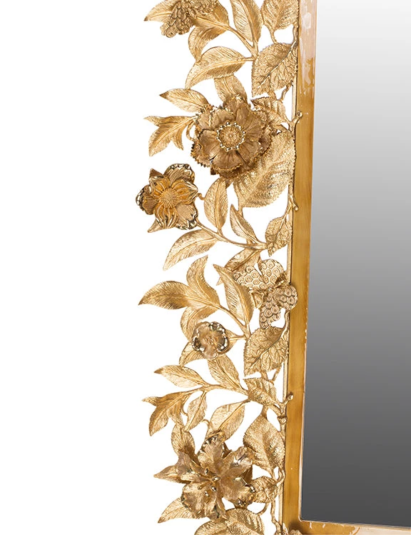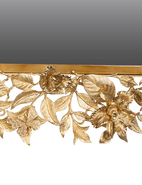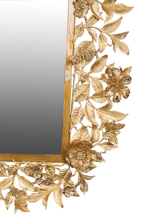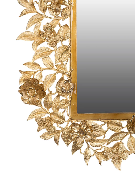 The pure unadorned beauty of our Camille Gilded Flora & Fauna Mirror shines through with hand-polished metal leaves, flowers, and butterflies, finished in 18K gold. More than 80 pieces are individually fitted together to create this exuberant silhouette for your home. Our artisans in Rhode Island and New York compose each mirror.