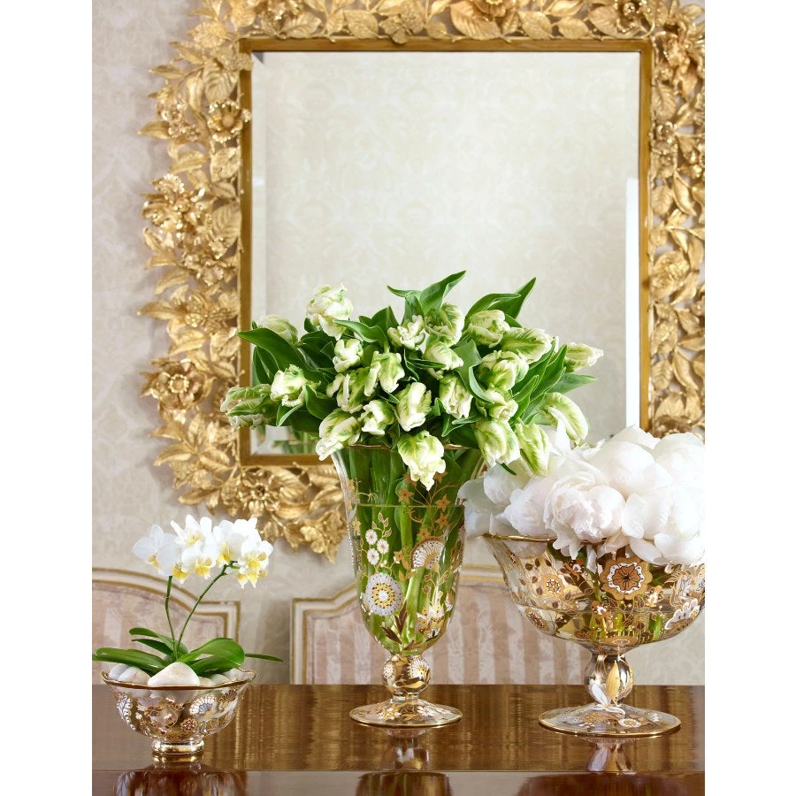 Cast pewter with an 18K gold and light brown antique finish with high-polished areas. Hand-enameled inner frame. Beveled glass mirror.