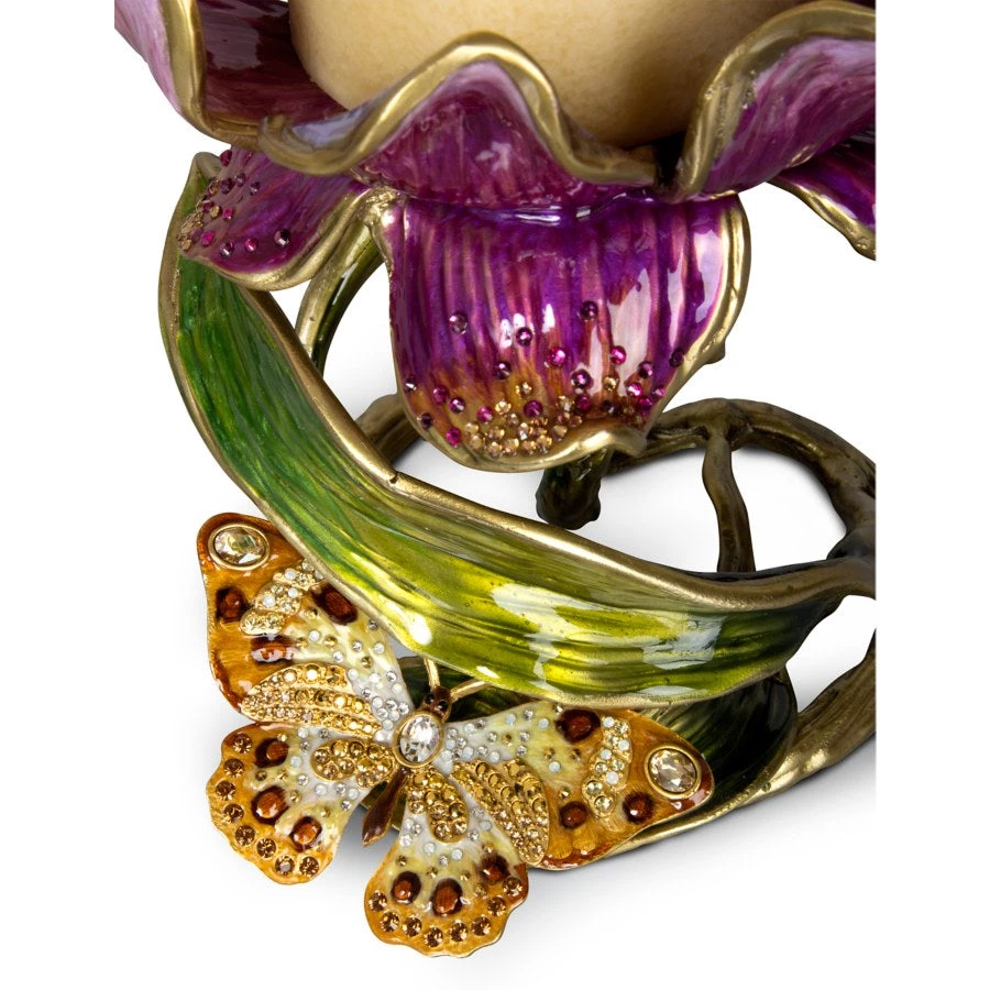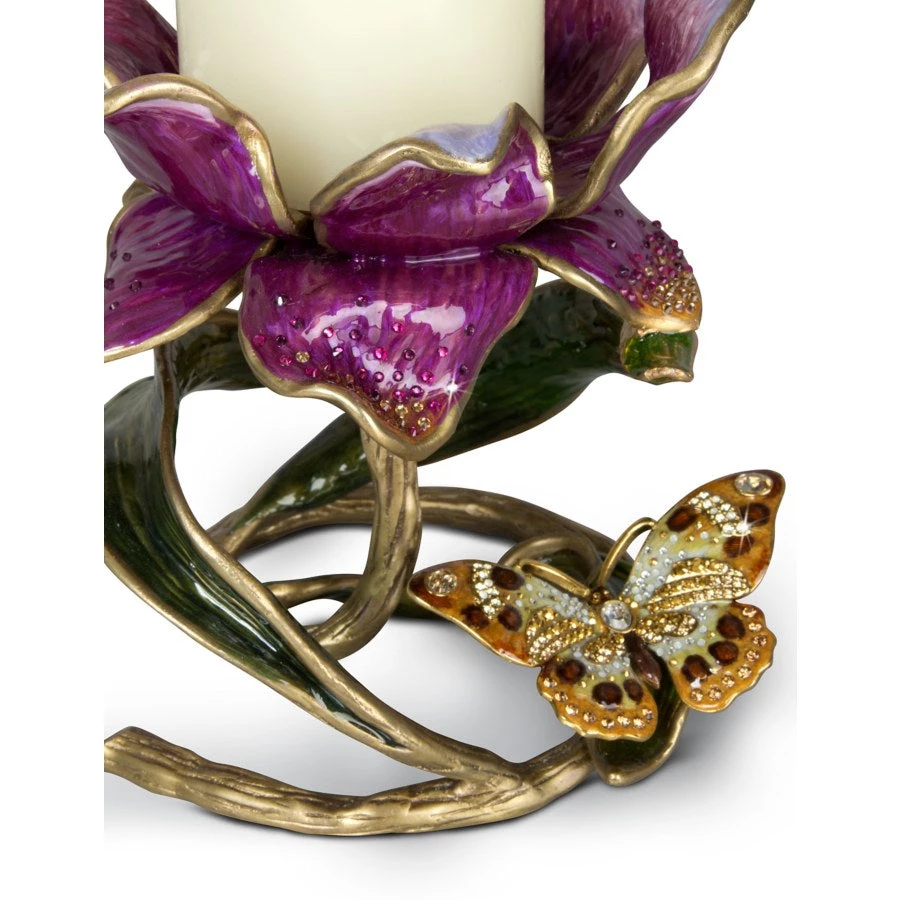 The patina of the polished brass Aimee Floral 7″ Pillar Candle Holder is illuminated by the glow of candlelight. Each one is first crafted in India, and then embellished with jeweled butterflies, flowers, and enamel in our New York workshop.