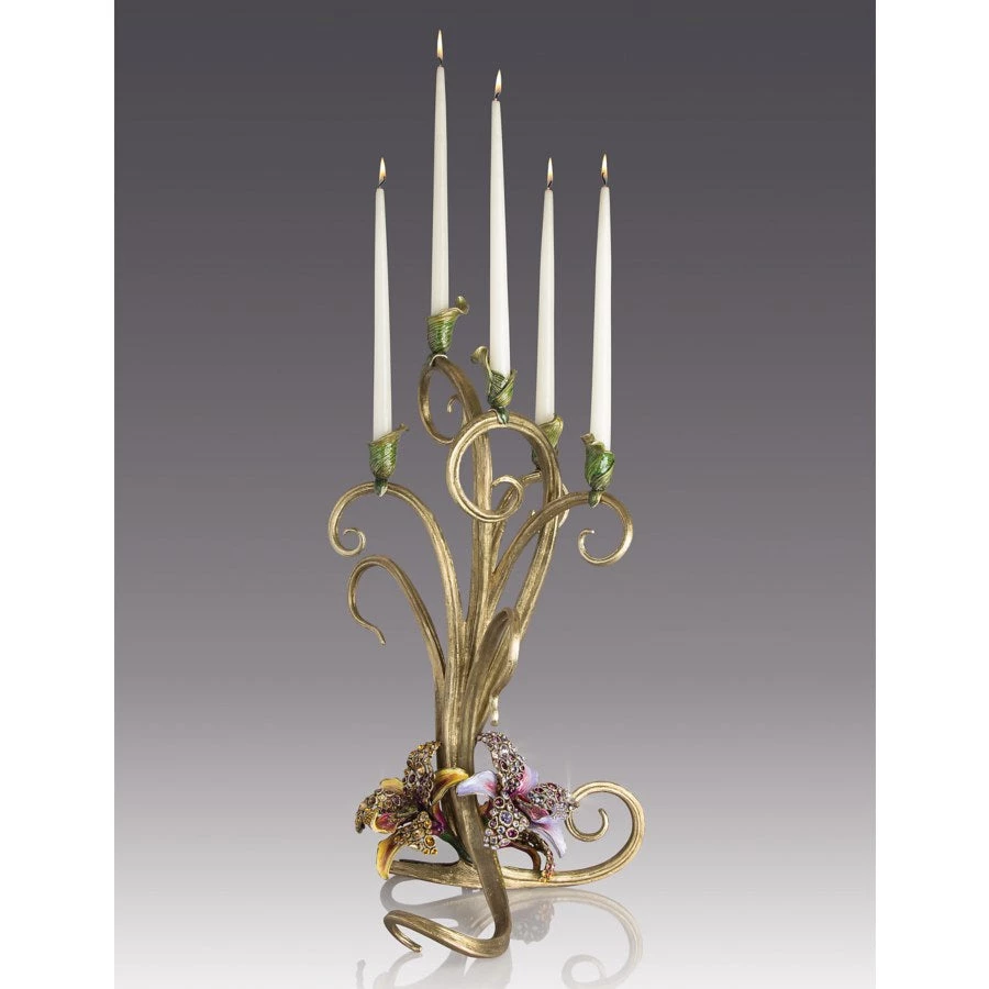 Opulent scrolls, ascending from jeweled orchids, hold leaf-wrapped candles in our Aubree Orchid Candelabra. Striated hand-formed brass candlesticks and candelabra from India; flowers and leaf candle cups cast and hand-set with large faceted crystals in Rhode Island.