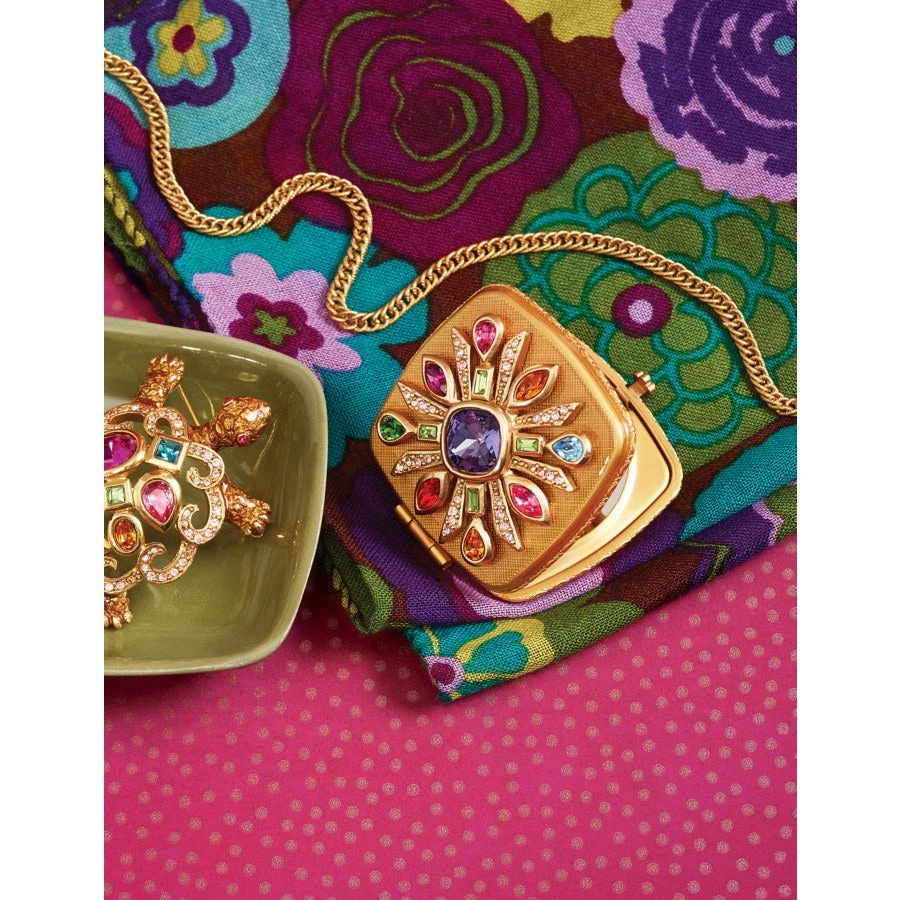 The Schuyler Maltese Compact is the quintessential Hollywood glamour accessory! How chic to hold this golden enameled compact with its jeweled Maltese hand-set with dazzling multi color crystals. Gently push the jeweled button closure and reveal two mirrors to make sure you always look gorgeous.