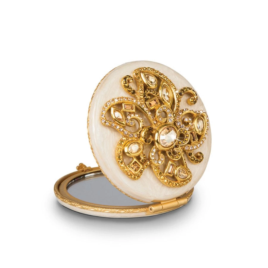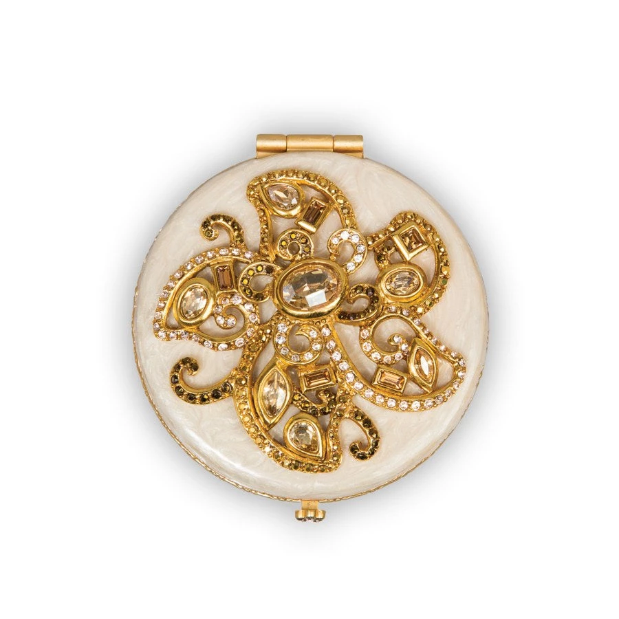 The Elisabeth Flower Compact is the quintessential Hollywood glamour accessory! How chic to hold this creamy enameled compact with its beautiful scroll flower with dazzling crystals. Gently push the jeweled button closure and reveal two mirrors to make sure you always look gorgeous.