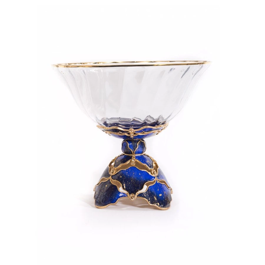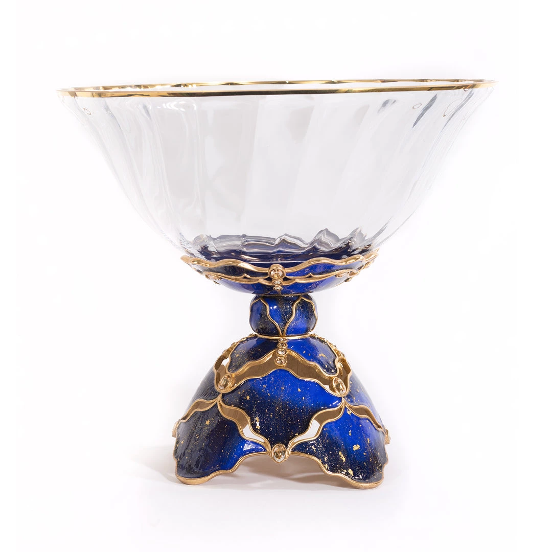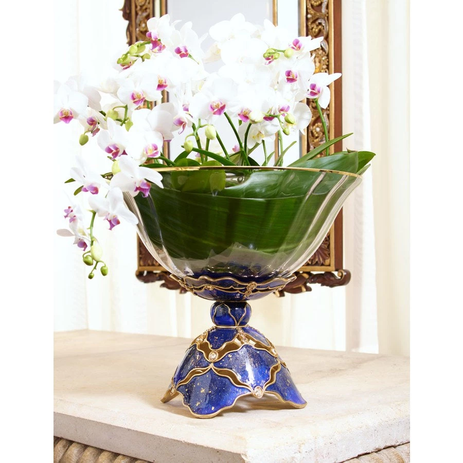 A new technique allows thin flecks of gold leaf to speckle the surface of the sapphire-blue-shaded enamel on the sculptural base of the gorgeous Beau Pedestal Bowl.