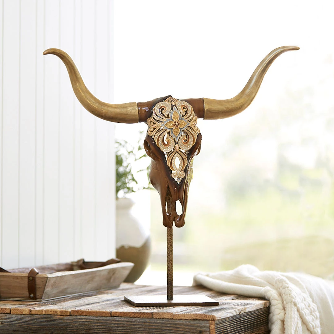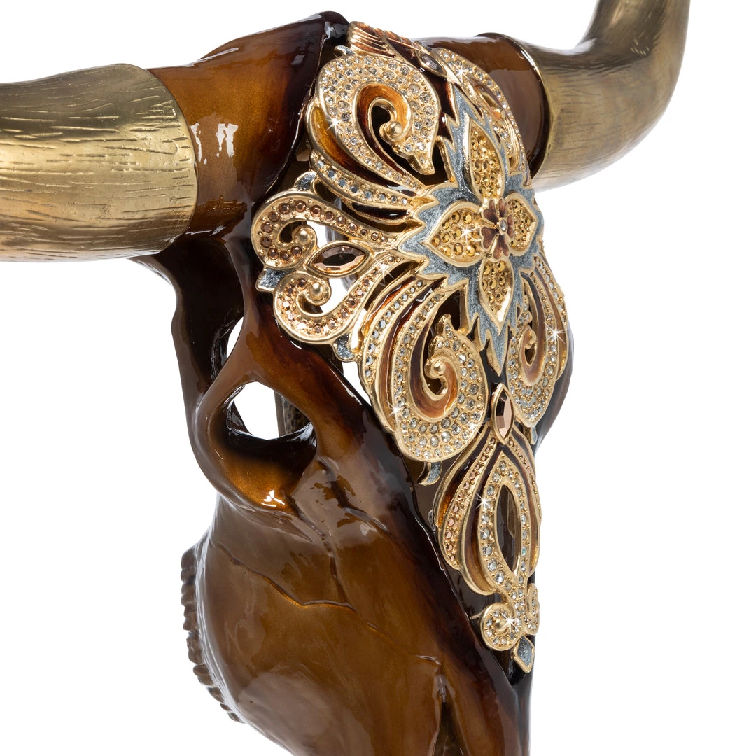 Metal cow skull, brass horns and stand from India foundry. Scroll front plate cast in pewter and finished in 14K gold from Rhode Island. Hand-enameled and hand-set with Swarovski® crystals at the Jay Strongwater Rhode Island workshop. Cow Skull includes coordinating hammered brass stand or can be hung on a wall.