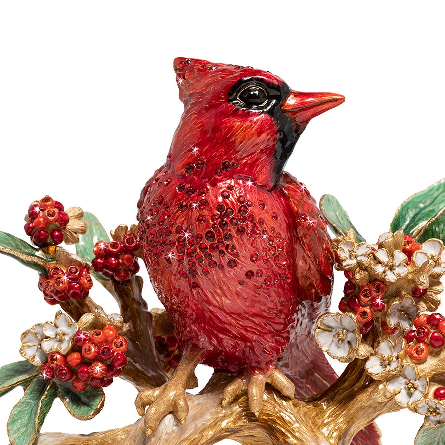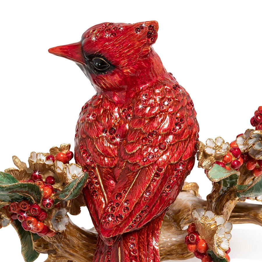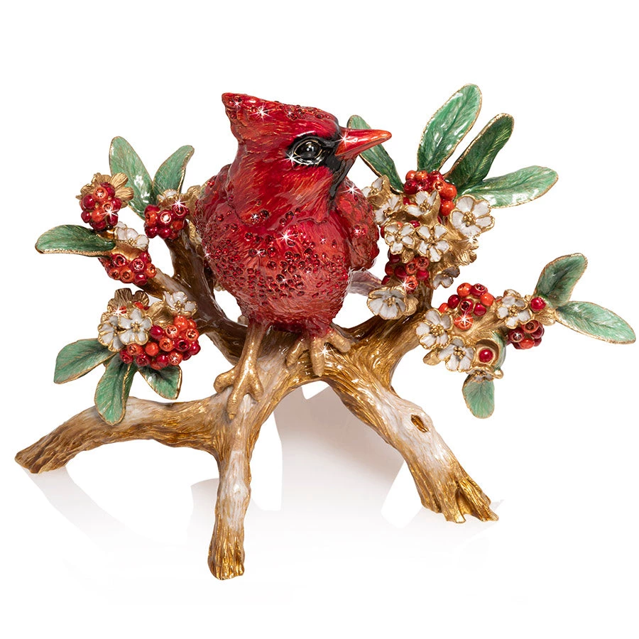 The bright red cardinal looks especially stunning against winters snowy white backdrop perched on a evergreen bough. Our Cardinal On Branch figurine is hand-painted with layers of translucent red enamels with hand-set Swarovski® light siam and scarlet colored crystals sparkling over his chest, crest, wings and tail. Each figurine in cast in 13 individual pewter sections, soldered together and finished in 14K Gold. Our finest artisans at the Jay Strongwater Rhode Island workshop bring all the elements together to complete each Cardinal on Branch Figurine.