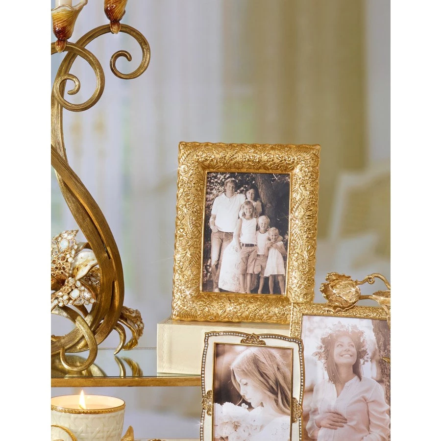 Sunlight glistens on our Katerina Ruffle Edge Floral 5″ x 7″ Frame, allowing the jeweler’s craft of hand carved textures and hand-polished details to shine. Pewter metal is finished in 18K gold at our Rhode Island workshop. The unadorned frame has a polished mahogany wooden back from Spain.