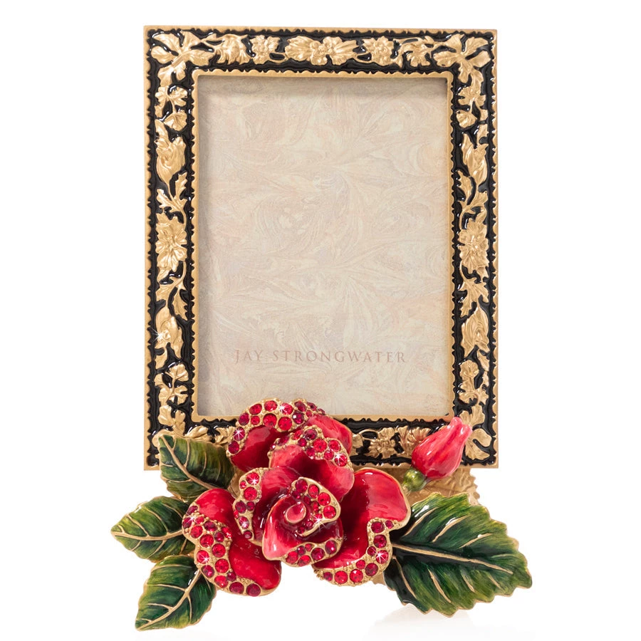 A single ruby-red rose adds dramatic flair to this 3″ x 4″ frame. Enameled by hand, accented by individually-placed Swarovski® crystals, and finished in 14k gold this piece sets a majestic stage for your most treasured photo memories.