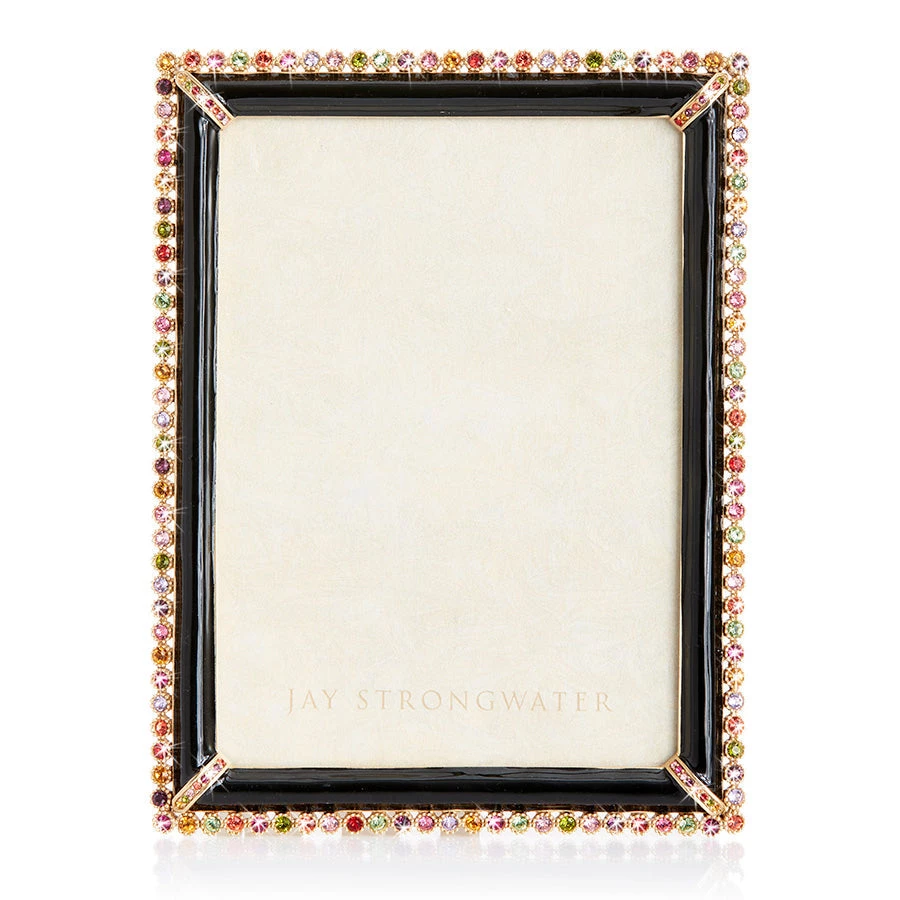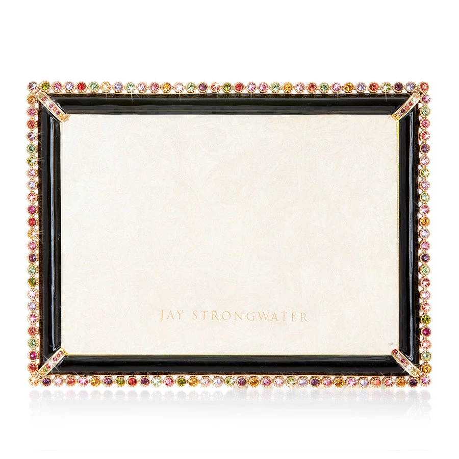 Our classic Lucas frame features a translucent black enamel which flows over a gold toned pewter frame. The edges sparkle with a rainbow of faceted colored crystals. This Lucas frame is finished with our signature pierced fleur-de-lis metal back plate and kickstand. Hand-crafted at the Jay Strongwater Rhode Island workshop. Stands vertically or horizontally.