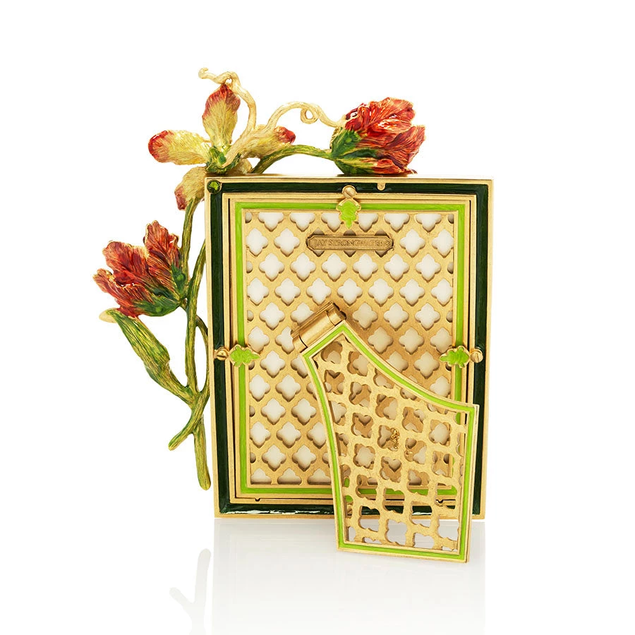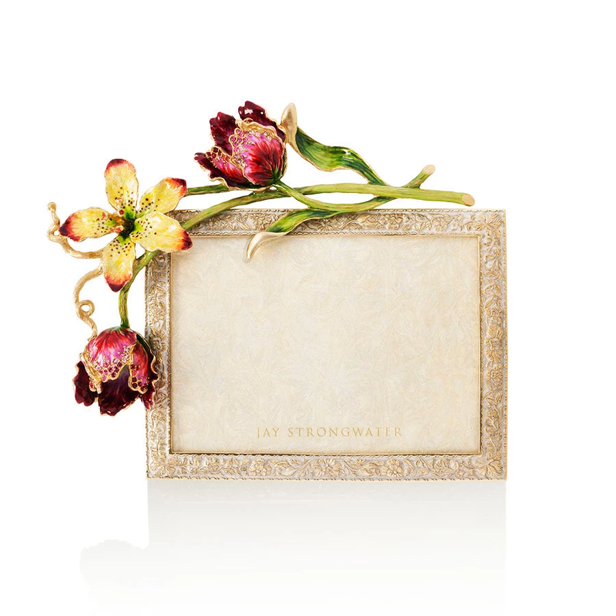 A spring bouquet of tulips and lily wraps around the Margery floral engraved frame; each blossom a full dimensional carving. Casted in pewter, finished in 14K Gold, the frame itself is washed in a thin layer of cream enamel to allow the gold floral pattern to shine through. The tulips and lily are ablaze in vibrant reds and yellow enameled petals with shaded green leaves and accented with Swarovski® crystals. With our signature, pierced fleur-de-lis metal back plate and kickstand – this frame is truly beautiful from any view. Stands vertically or horizontal.