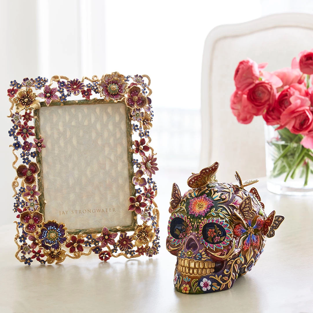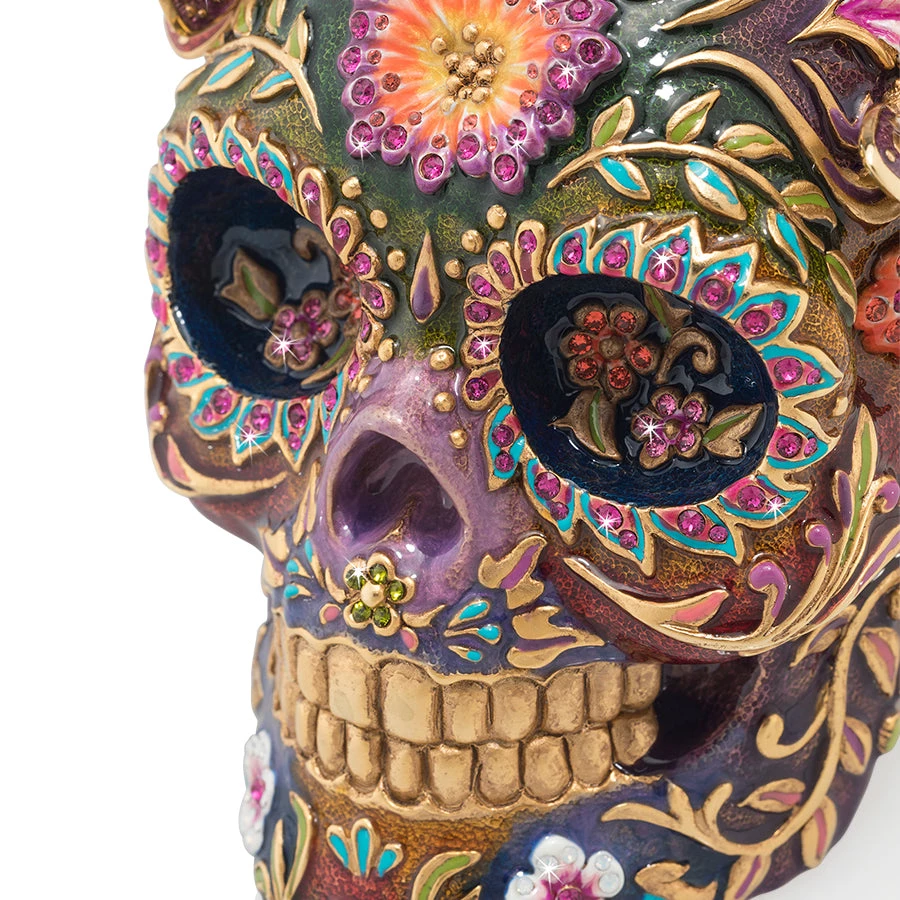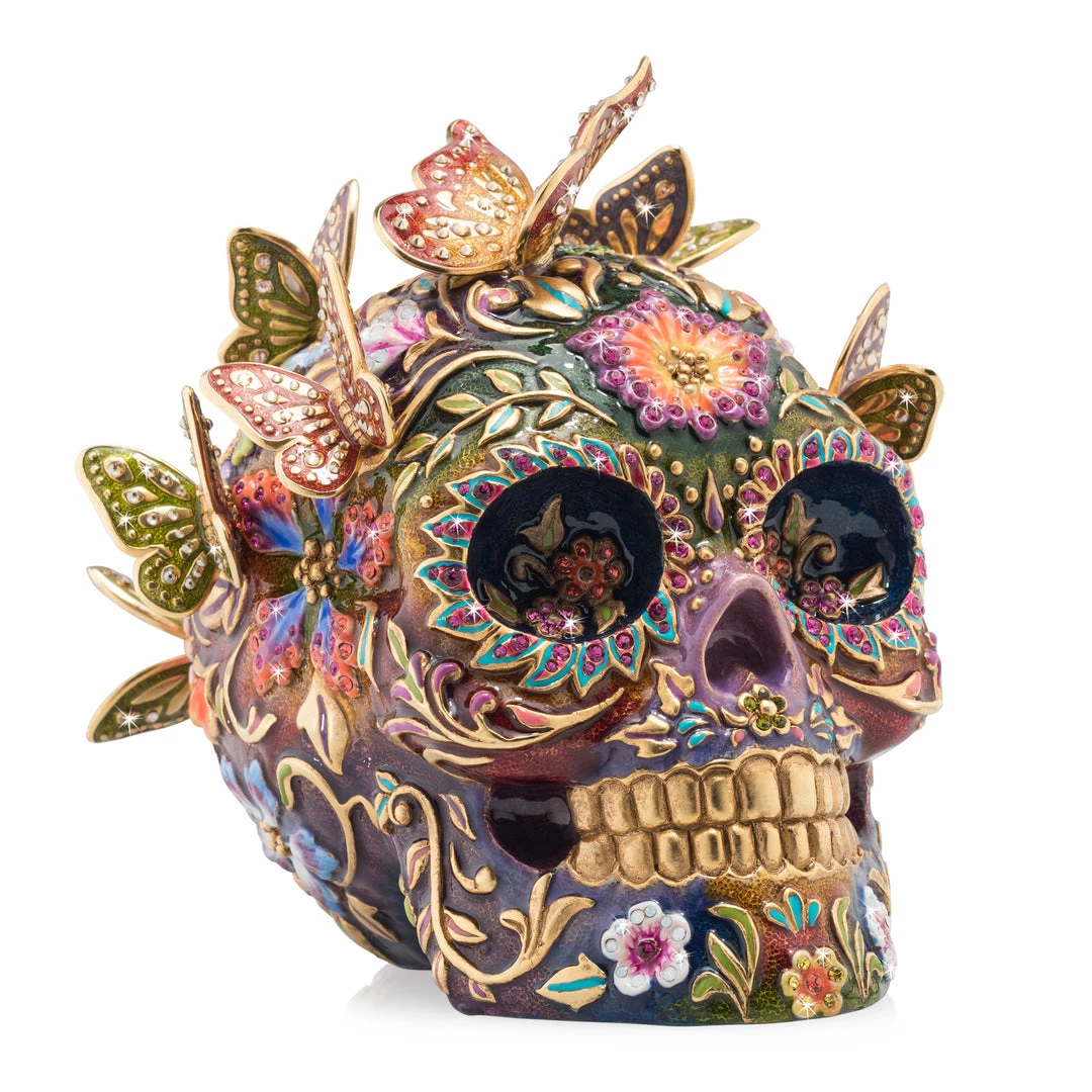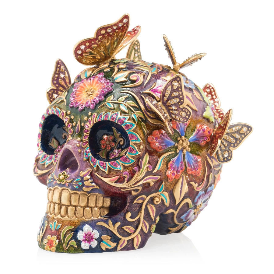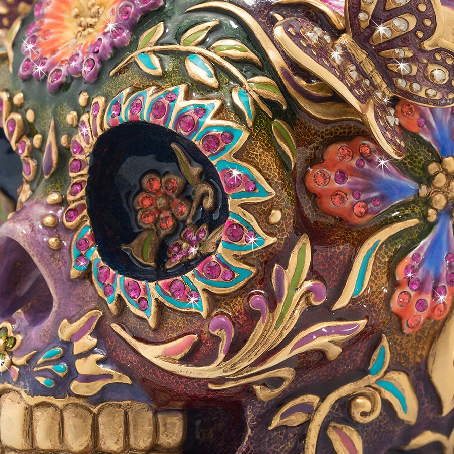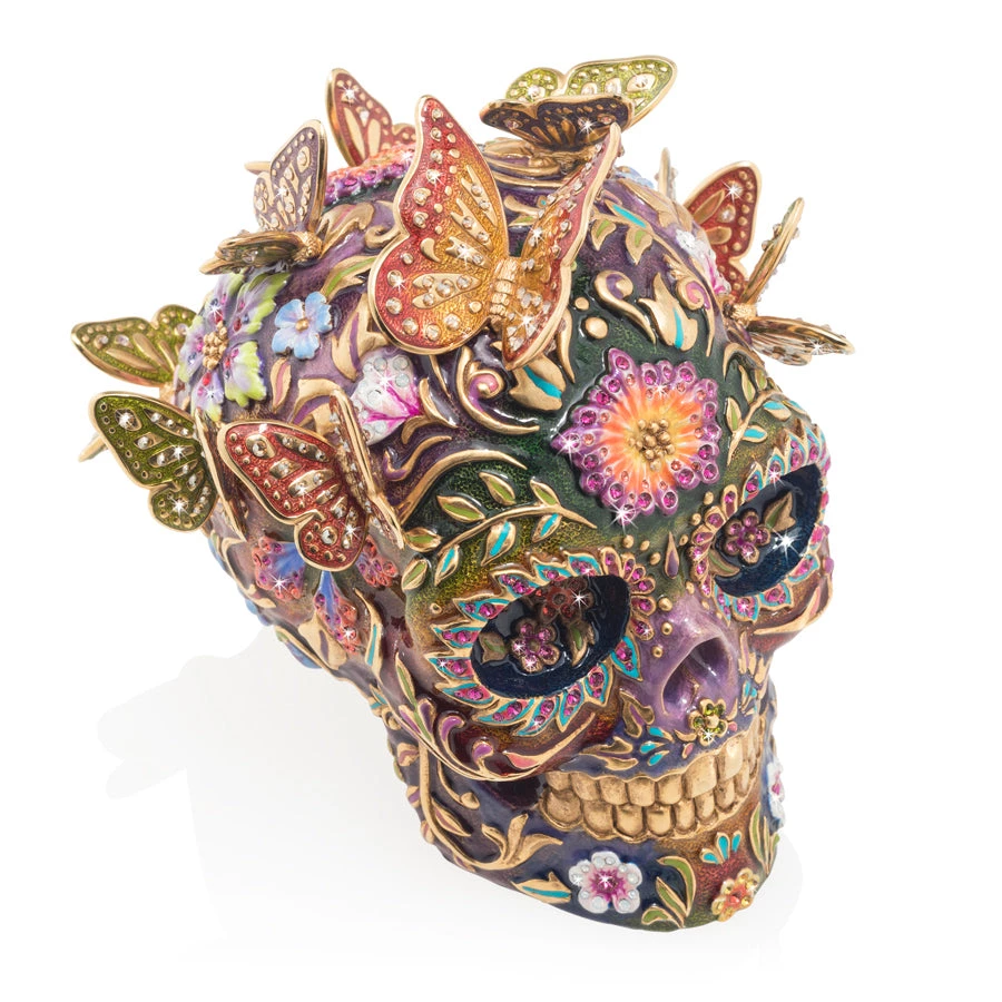 Inspired by the great heritage of Mexican Sugar skulls, we first carved our Frida Skull in clay with a raised all-over floral pattern highlighted with jeweled fluttering butterflies. Casted in pewter, finished in 18K gold and beautifully painted in 21 colors of enamel by our finest artisans in Rhode Island. Our Frida Skull sparkles with hand-set Swarovski® crystals in shades of Fuchsia, Padparadscha and Tanzanite.