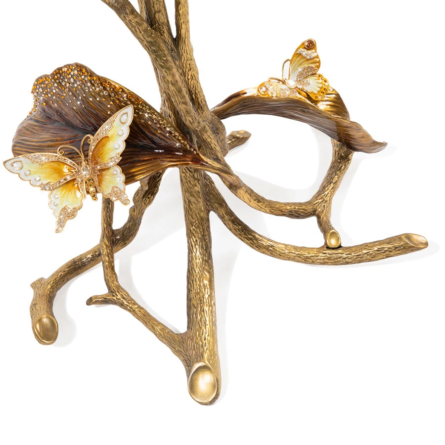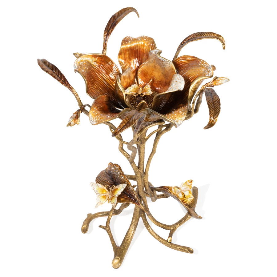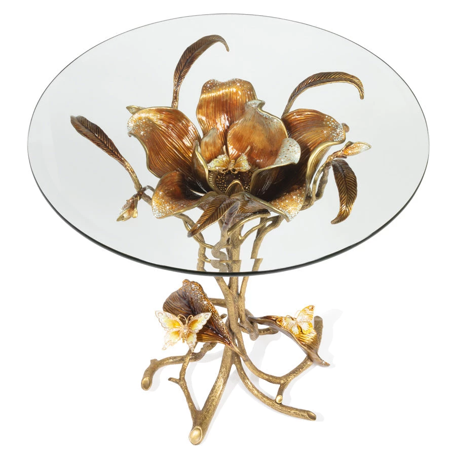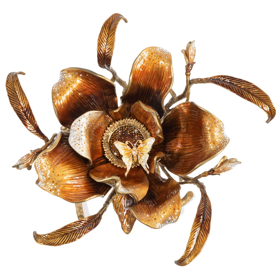 You can feel the hands of the artisans forging the brass to form each individual Magnolia Table. A singular oversized blossom under a beveled glass top, supported by twisted twigs and branches with jeweled leaves and butterflies. For spring, we revisit this now classic design in a warm palette of amber, caramel and cream enamels handset with over 2,000 topaz and opal Swarovski® crystals.