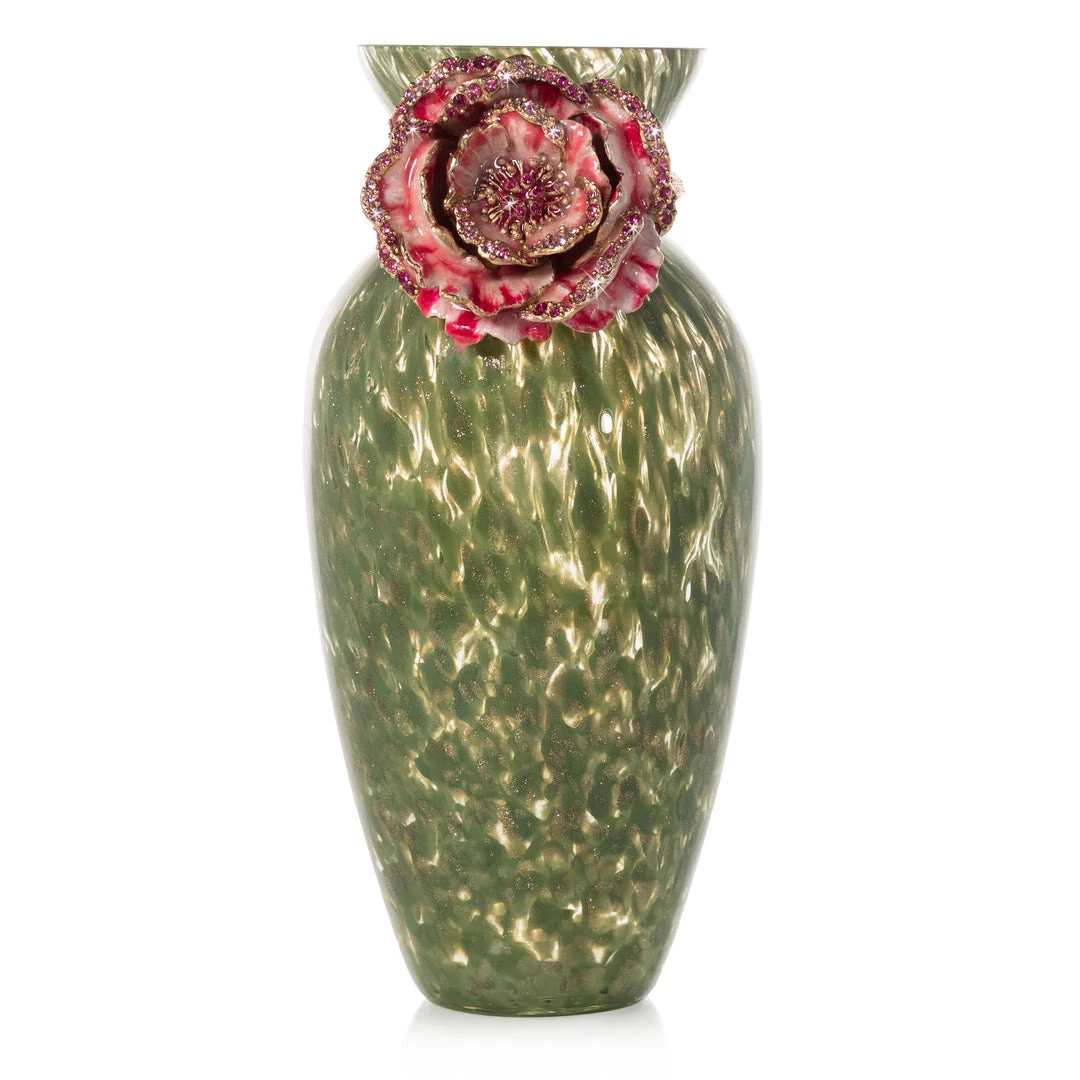 A lush peony blossom accents our green and gold speckled glass Priscilla Vase. Each cast metal bloom is hand decorated and set with twinkling Swarovski® crystals.