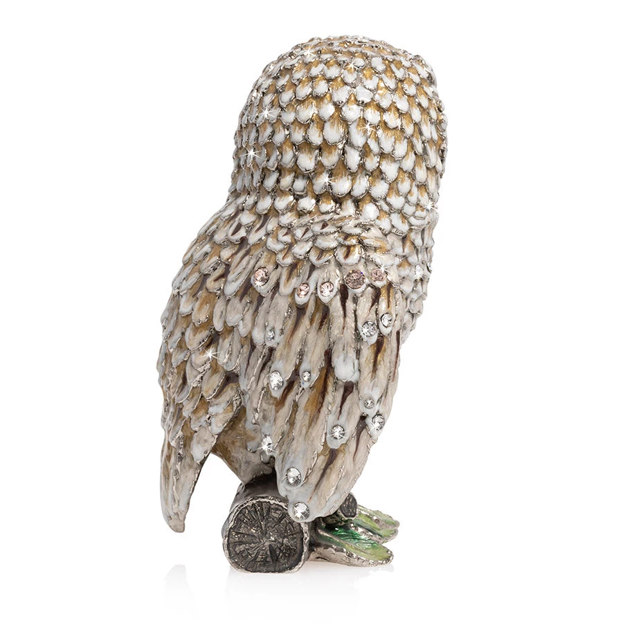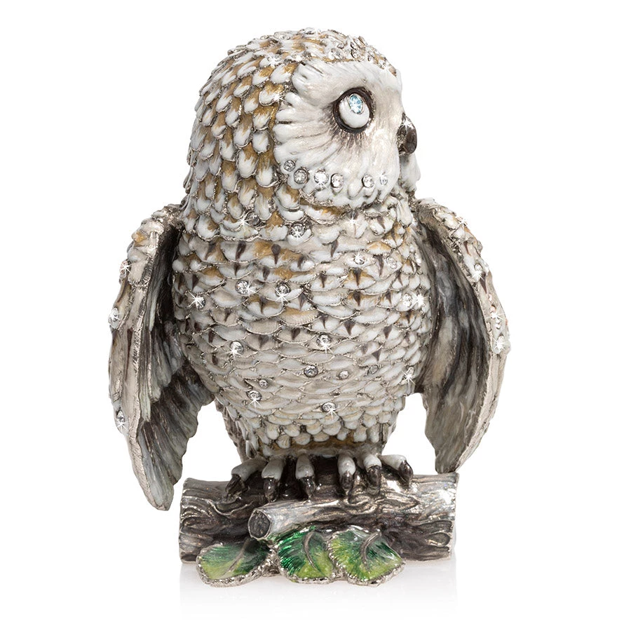 How adorable! Our cute, snowy owl sits majestically on a tree stump gazing out through his bright aquamarine crystal eyes. This figurine was brilliantly carved over several months in clay, molded in pewter and finished in antique silver. Our finest artisans at the Jay Strongwater Rhode Island workshop spend hours painting each feather on the Hildy Owl Figurine in ombre shades of pearly white, silvery grey, woody brown and gunmetal grey enamels. Hand-set with luminous Swarovski® crystals in shades of black diamond and smoky quartz. Beautiful on his own or sitting with the regal Milo Owl figurine.