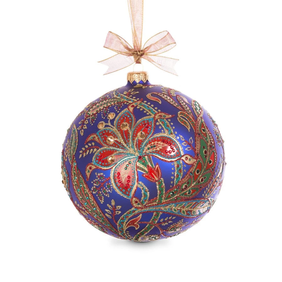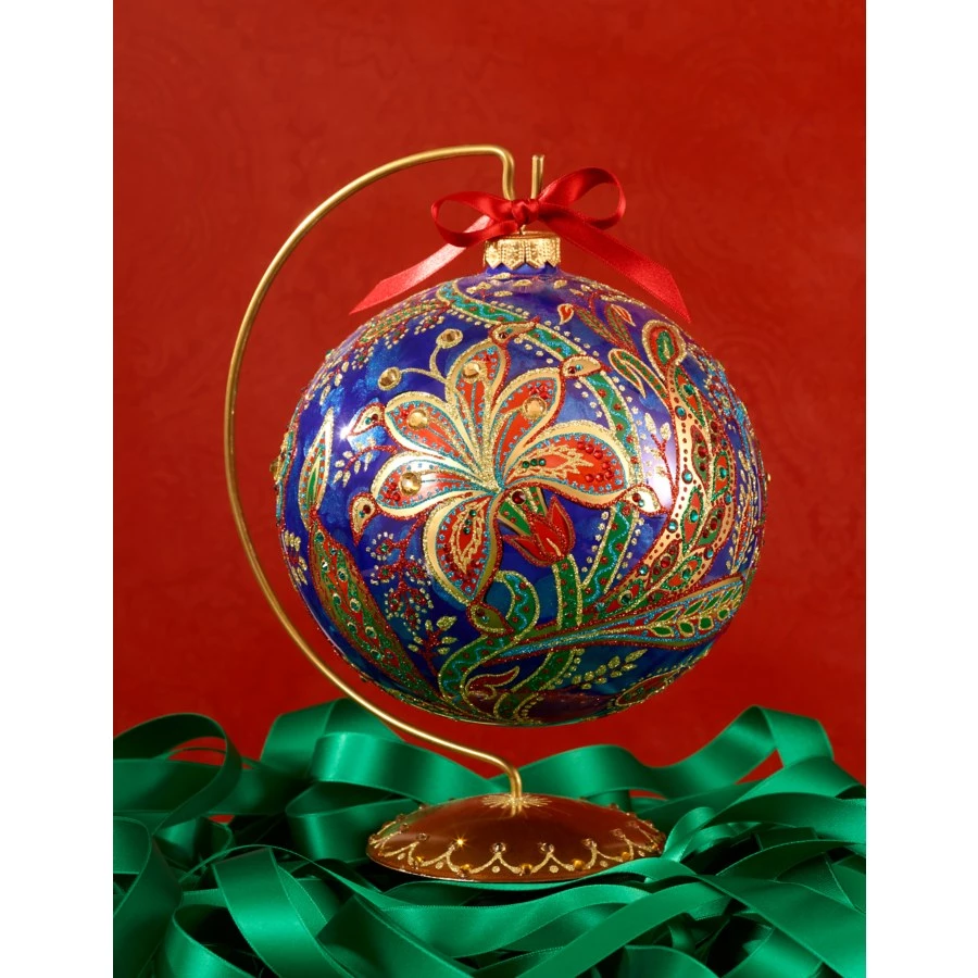 Our tradition continues of creating one limited-edition opulent ornament every year, each one signed and numbered by Jay himself! This year’s design was inspired by a found, archived paisley drawing. We reinterpreted it in enamels, crystals, and glitter in exuberant hues of ruby, emerald, and gold swirling around an oversized, sapphire-toned glass ball. Made by old-world glass artisans in Poland and limited to an edition of 350.