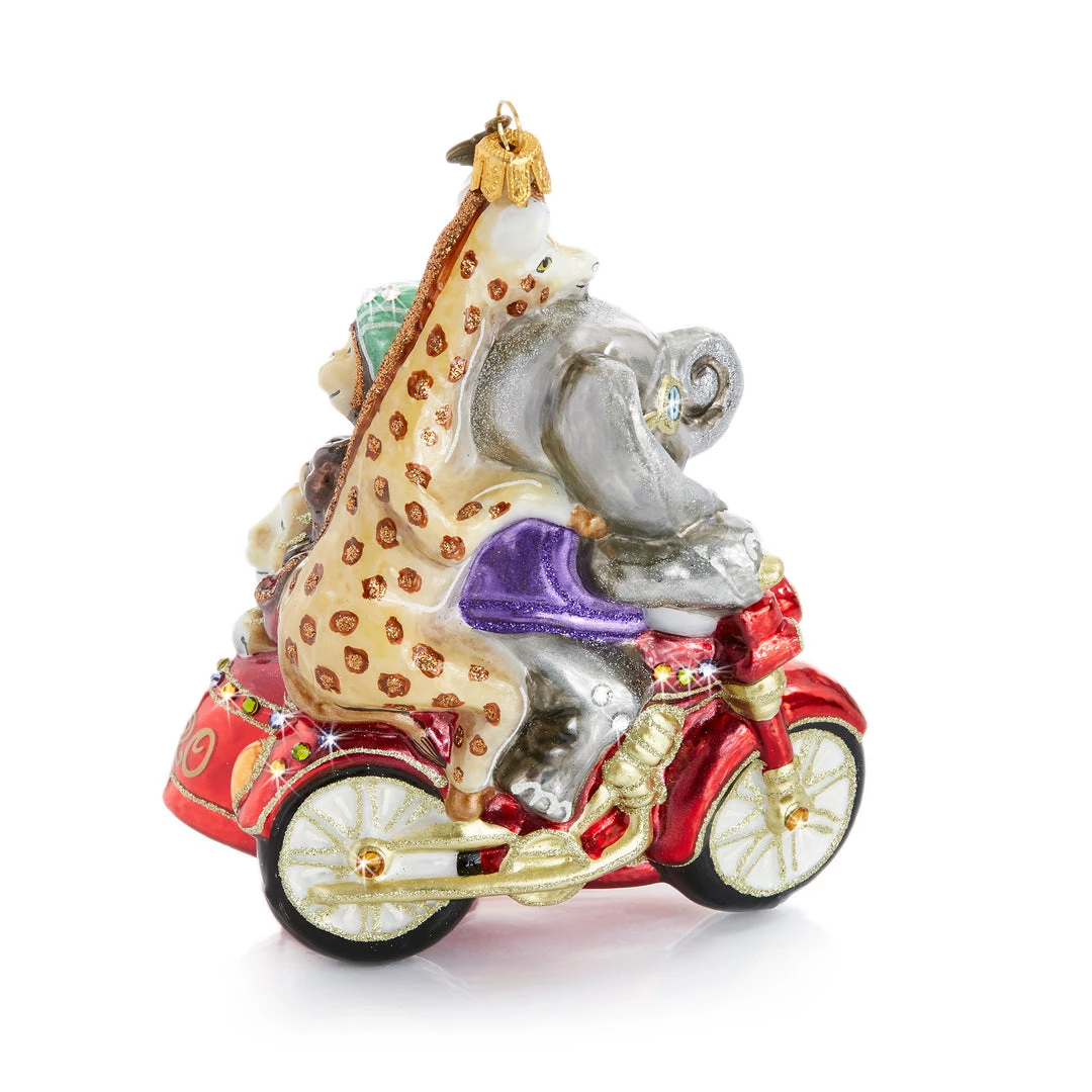 How adorable! Our baby jungle animals have all piled into our glittery jeweled moped to welcome Baby’s First Christmas. Sculpted first in clay and then mouth-blown in glass by old-world glass artisans in Poland. Each animal is delightfully detailed in enamels and glitter and hand-set with Swarovski® crystals.