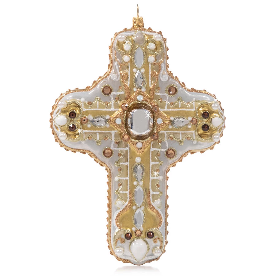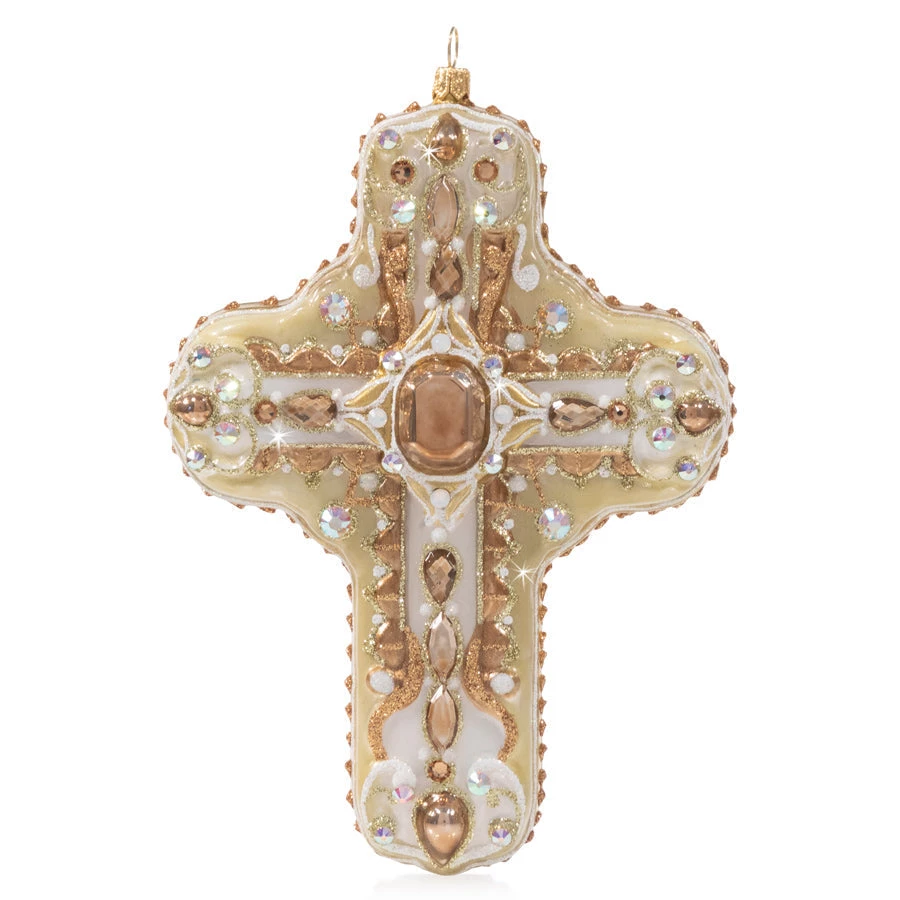 Hand-painted in iridescent whites, warm coppers and glimmering golds, this ornate glass cross is adorned with Swarovski® gems and tiny pearls. Hang it high on your tree and watch it twinkle in the light.
