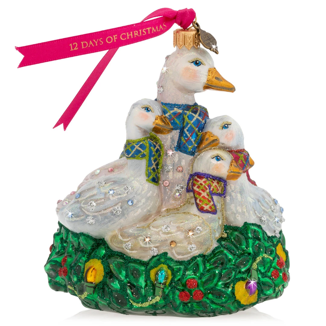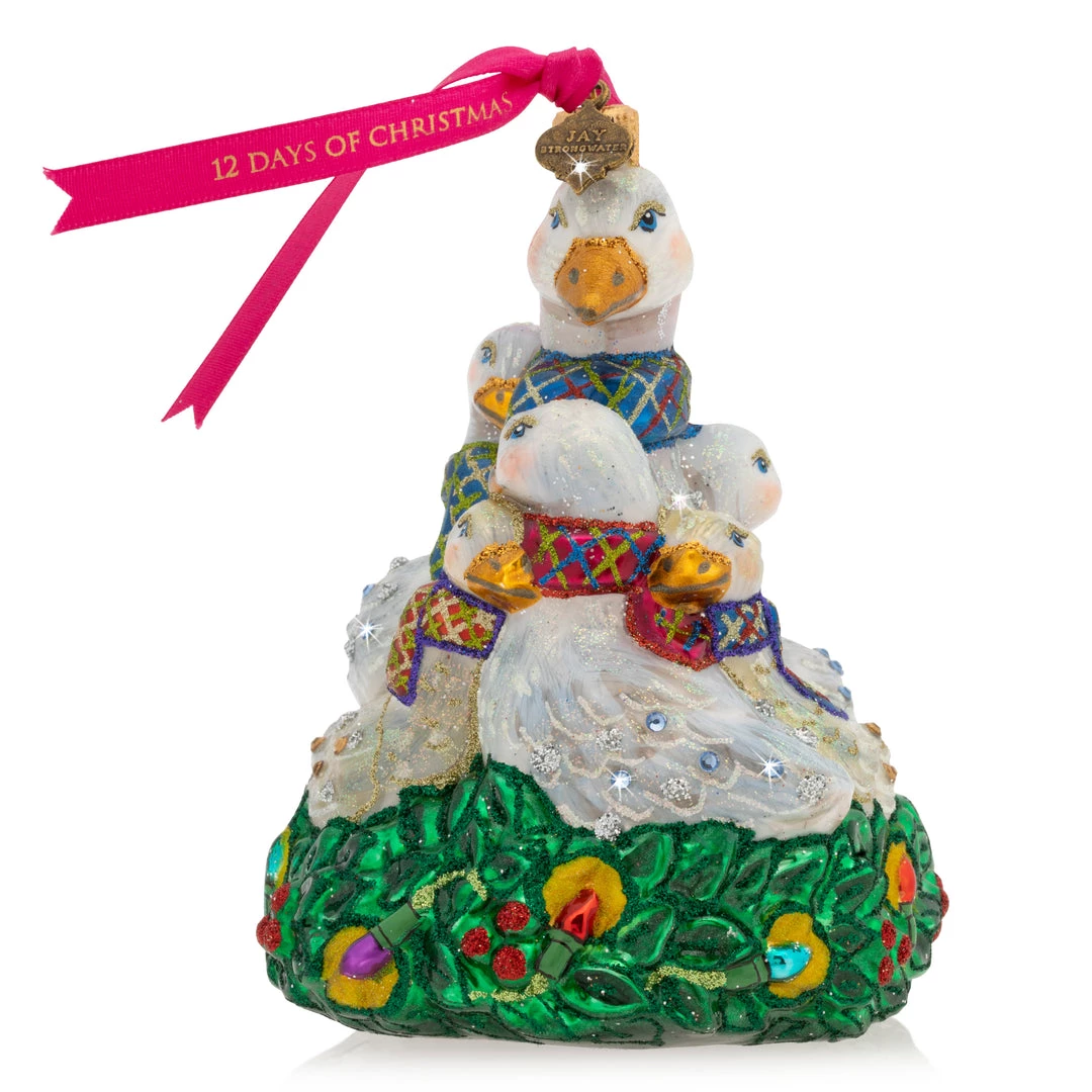 Our “12 Days of Christmas” Holiday ornament series continues with the 2019 introduction of our Six Geese of Laying Glass Ornament. These six geese were carved first in clay and then mouth-blown in glass by old-world glass artisans in Poland. Hand-painted in creams with their jeweled ruby, emerald and sapphire scarves and laying on a lush green holiday wreath. Embellished with fine glitter details and hand-set Swarovski® crystals.