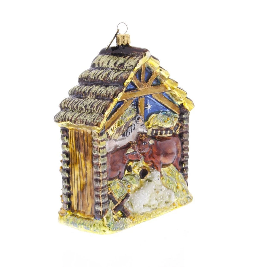 Our only Nativity ornament – first introduced years ago – and forever a Jay Strongwater classic. The Holy Family Ornament was sculpted first in clay and then mouth-blown in glass by old-world glass artisans in Poland. One side of the manger protects Mary and Joseph as they welcome baby Jesus under the glittery midnight sky while the other side completes the scene with the donkey, ox and sheep. Embellished with fine glitter details and hand-set Swarovski® crystals.
