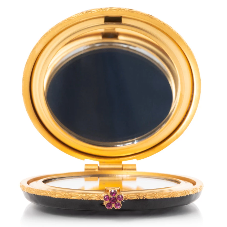 A rainbow-hued butterfly pops against a background of glossy black enamel on the lid of this perfectly palm-sized compact mirror. Highlighted by 14K gold accents and a spectrum of over 40 Swarovski® crystals, it is the perfect glamorous accessory for your collection.