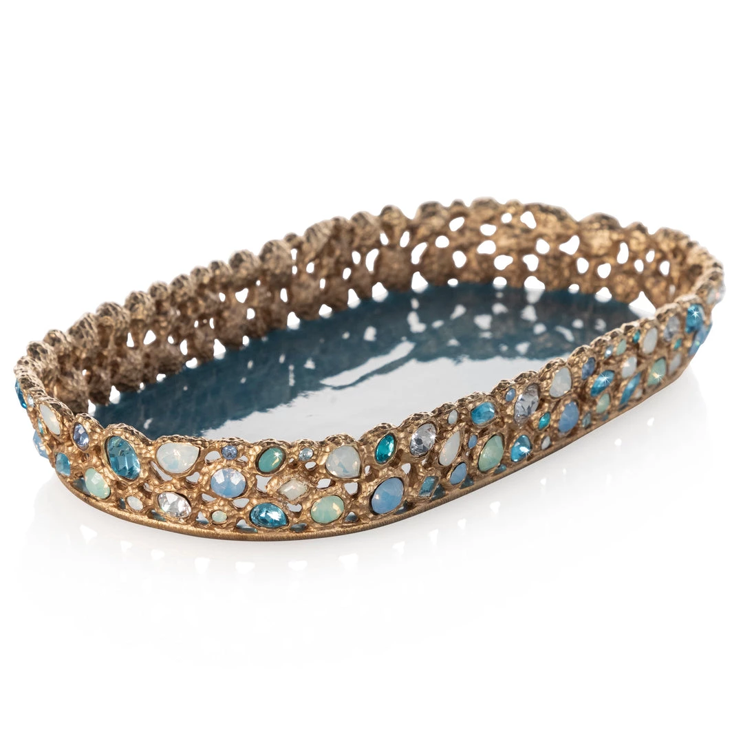 Evoke the mesmerizing sparkle of sunshine on the sea with this enchanting and aquamarine tray. Surrounded by 122 crystals in soothing marine hues set into a golden lattice frame, this piece channels a luxurious seaside vacation; the tranquility of the ocean with a touch of tasteful glamour.