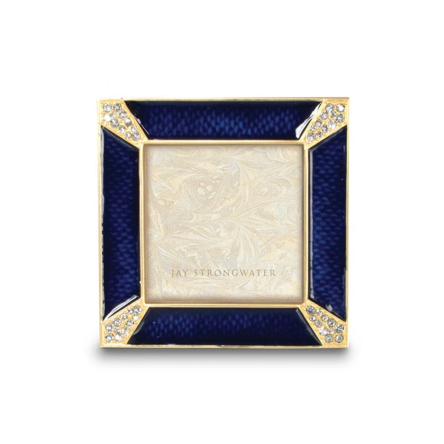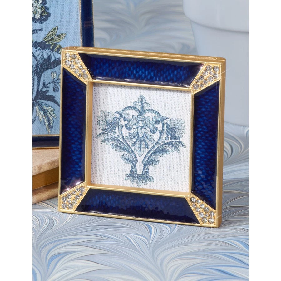 Welcome a new season with this fresh palette of translucent blues mixed with white. A charming composition of metal, enamel, and crystals in delft garden hues graces the Leland Pavé Corner 2″ Square Frame.