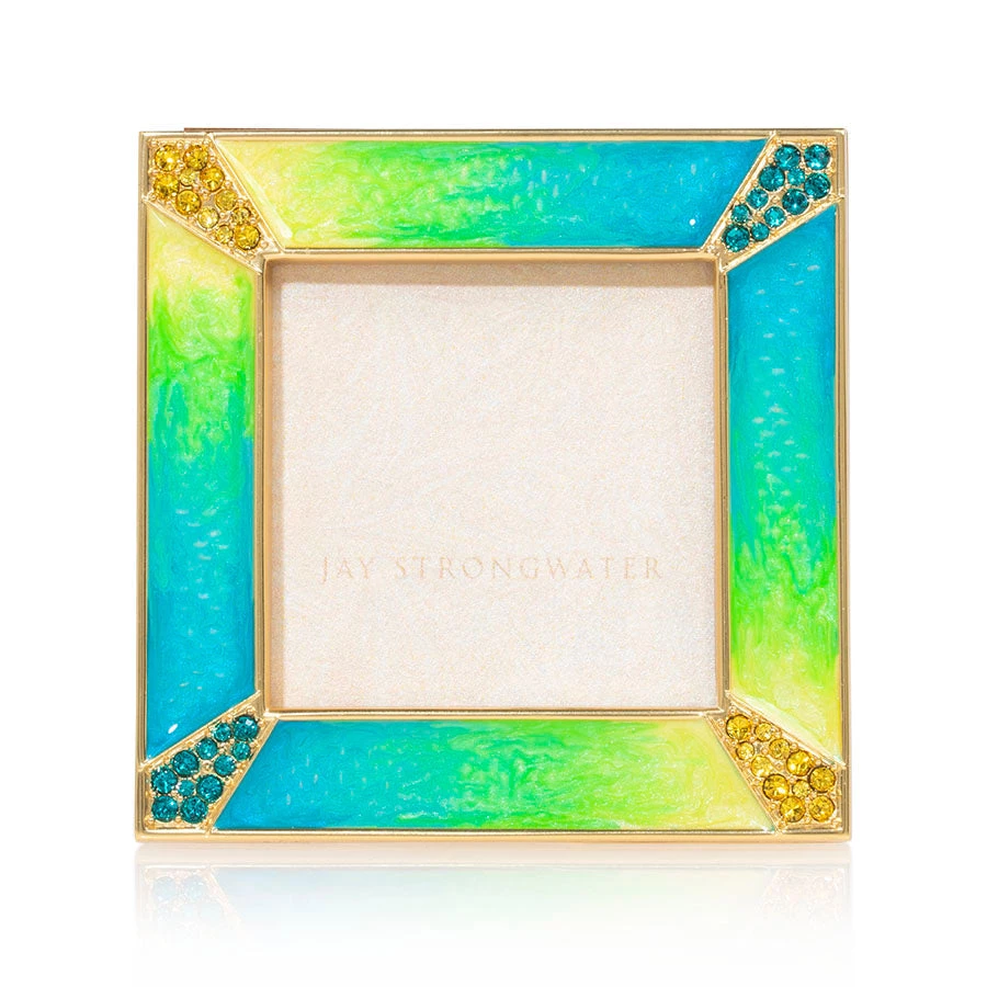 Frame your loved ones with a pop of electric green enamel and jewels! We created a special edition of our classic Leland 2” Pave Corner frame in a vivid ombre of chrome yellow to lime green enamel accented with Swarovski® Topaz and Teal crystals. Hand-painted enamels and hand-set crystals on a 14K gold finished metal frame with our signature enamel back plate – this frame is truly beautiful from any view.