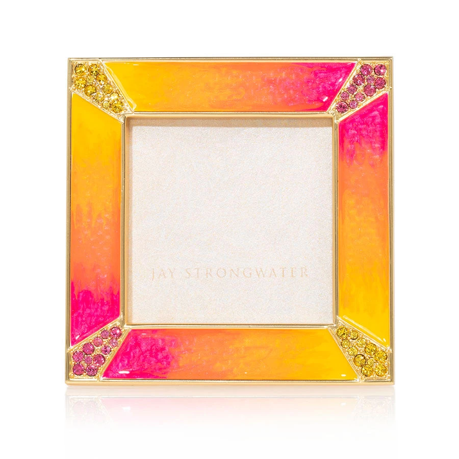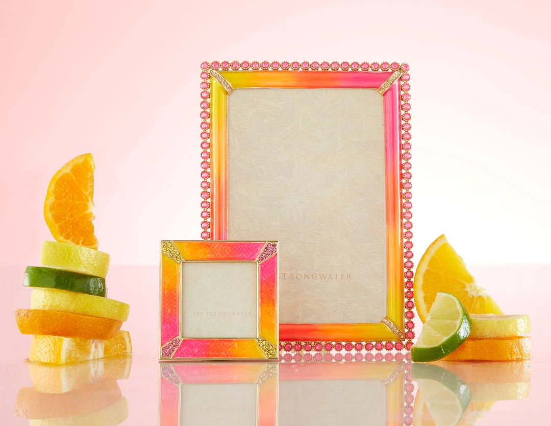 Frame your loved ones with a pop of electric pink enamel and jewels! We created a special edition of our classic Leland 2” Pave Corner frame in a vivid ombre of sunset to pink enamel accented with Swarovski® Topaz and Rose crystals. Hand-painted enamels and hand-set crystals on a 14K gold finished metal frame with our signature enamel back plate – this frame is truly beautiful from any view.