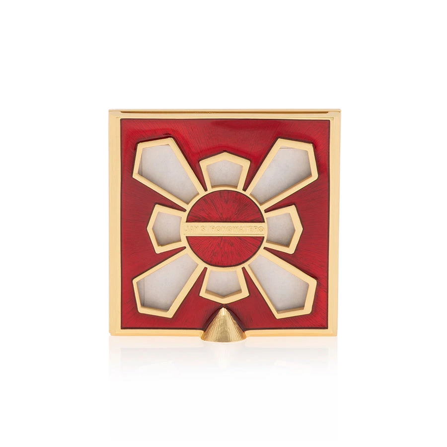 Layers of hand-painted translucent ruby enamel surround this frame with a dazzling luminosity. This Pavé Corner Square Frame was casted in pewter, finished in 14K gold, and hand-set with sparkling Swarovski® champagne crystals. With our signature, all ruby enamel back plate – this frame is truly beautiful from any view.