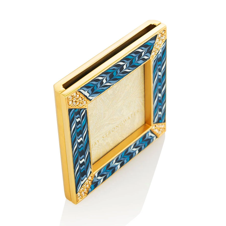 Inspired by antique Venetian marbleized papers we start this Leland frame with a layer of navy enamel and then carefully swirl in stripes of cobalt, cream and periwinkle. Hand-set with golden crystal corners and an equally finished enameled back plate – this frame is truly beautiful from any view.