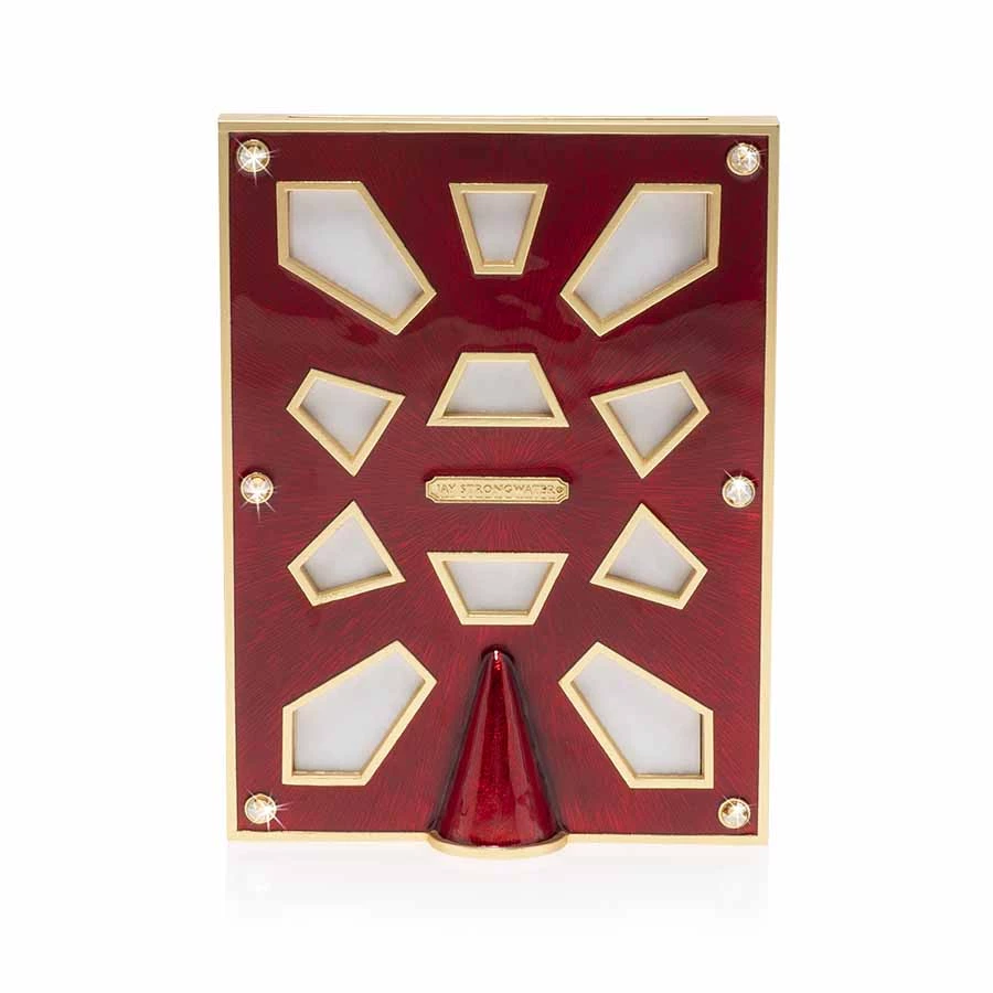 Layers of hand-painted translucent ruby enamel surround this frame with a dazzling luminosity. This Pavé Corner Frame was casted in pewter, finished in 14K gold, and hand-set with sparkling Swarovski® champagne crystals. With our signature, all ruby enamel back plate – this frame is truly beautiful from any view. Stands vertically only.