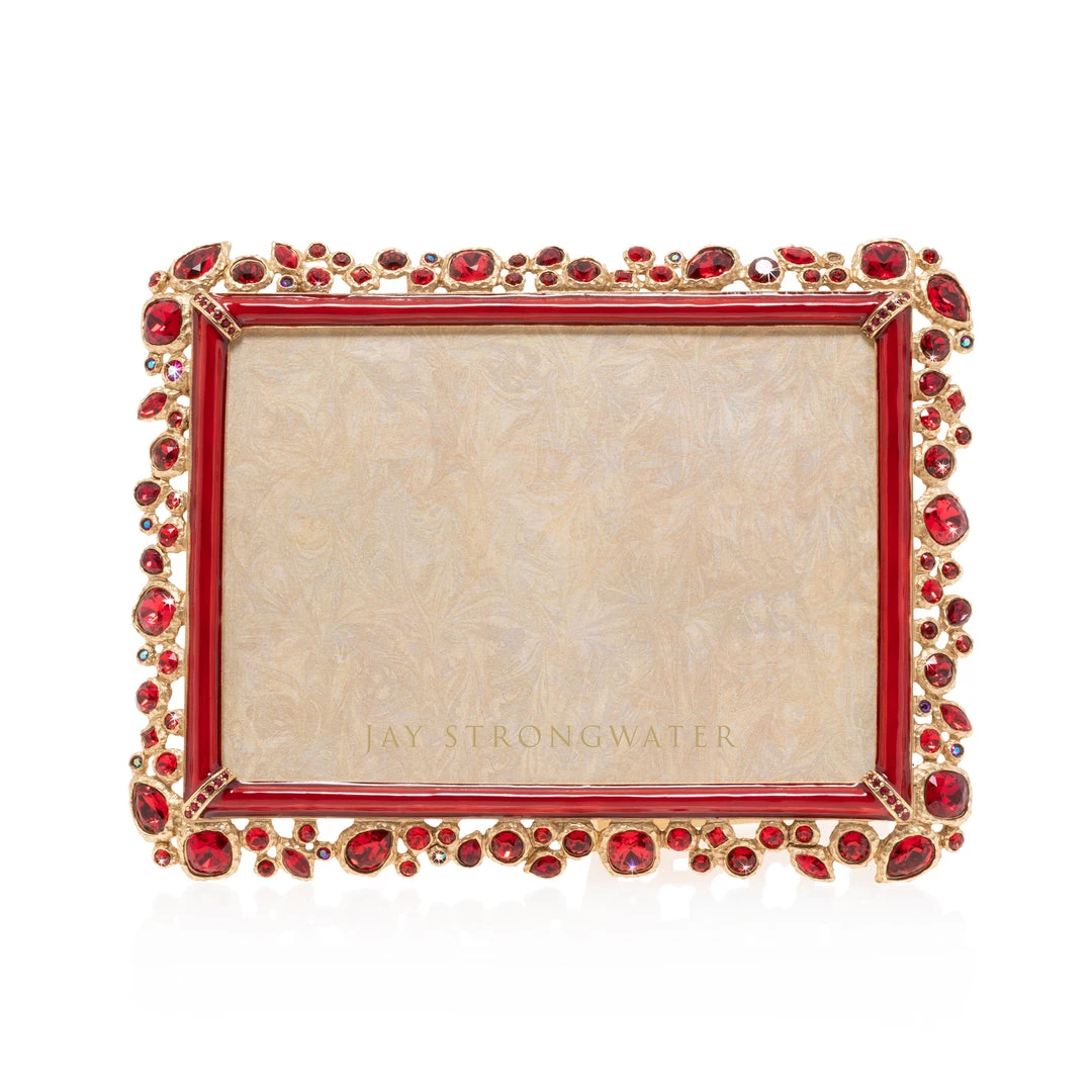 Surround your true love with a waterfall of Swarovski®’s finest faceted large crystal stones in tones of Ruby, Scarlet and Siam wrapping around a slim enameled border. This Bejeweled Frame was casted in pewter, finished in 14K gold and beautifully painted in luminous ruby enamels by our finest artisans in Rhode Island. With our signature fleur-de-lis metal back plate and kickstand – this frame is truly beautiful from any view. Stands vertically or horizontal.