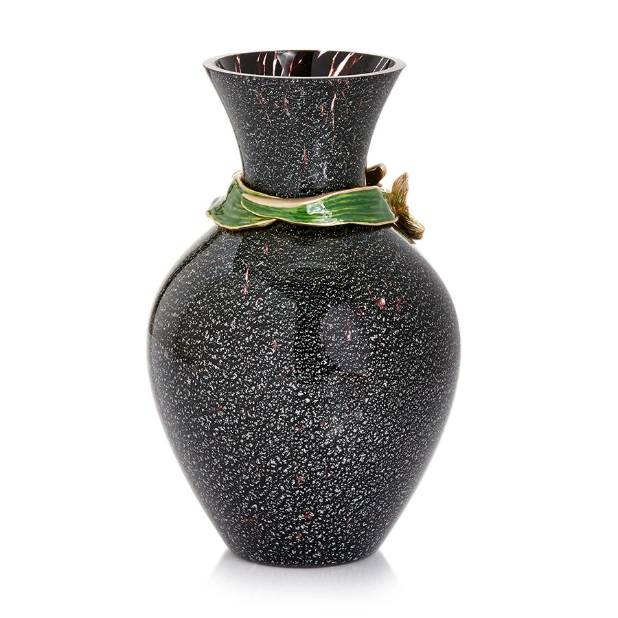 This simple elegance of a black dappled glass vase dramatically wrapped with a wide collar of sculpted tulips. The collar is cast in metal, hand-enameled in vibrant hues, adorned with stunning Swarovski® crystals and finished in 14K gold. The Lilia vase holds a beautiful bouquet and makes the perfect gift!