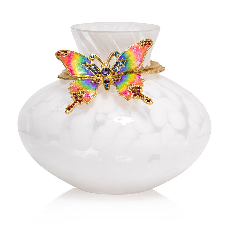 A rainbow enameled jeweled butterfly pops from the gold leaf collar on the Lorelei Butterfly vase! This gracefully proportioned white speckled glass vase holds a beautiful bouquet and makes the perfect gift. Metal leaf collar and butterfly finished in 14K gold, hand-painted in bright enamels with hand-set sparkling crystals.