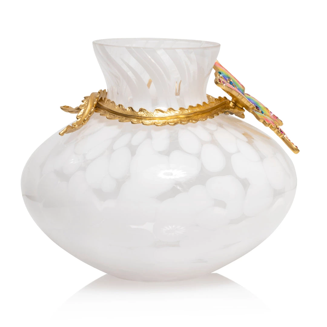 Mouth-blown white dappled glass vase with a 14K gold finish metal leaf collar with butterfly. Hand-painted enamels and hand-set with crystals. Imported.