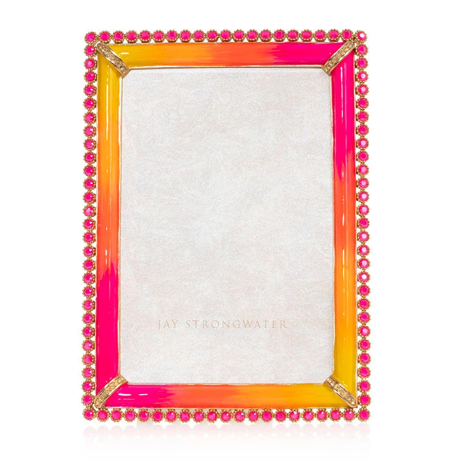Frame your loved ones with a pop of electric pink enamel and jewels! We created a special edition of our classic Lorraine 4” x 6” frame in a vivid ombre of sunset to pink enamel bordered in a limited edition of Swarovski® electric pink crystals. Hand-painted enamels with hand-set crystals on a 14K gold finished metal frame created at the Jay Strongwater Rhode Island workshop. With our signature, fleur-de-lis metal back plate and kickstand – this frame is truly beautiful from any view. Stands vertically or horizontal.