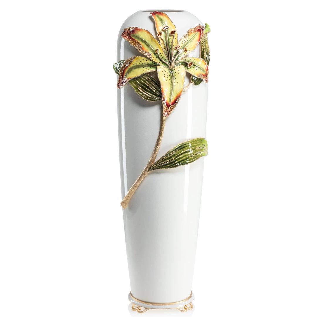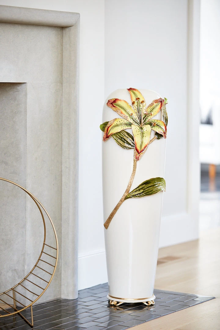 Our artistry shines with an exuberant jeweled lily wrapping around a tall ceramic vase – a major statement on its own or beautiful when filled with flowering branches. The Luna Lily vase began with our artisan’s wax model capturing the lily’s petals, leaves and stem draped over the curve of the vase. Then individually molded in pewter, finished in 14K gold and hand-painted in sunny yellows, leafy greens and tiger orange accents. Hand-set with over 400 Swarovski® crystals in shades of Topaz, Olivine and Padparadscha. Ceramic vase with creamy white crackle finish set on a metal base. Our finest artisans at the Jay Strongwater Rhode Island workshop bring all the elements together to make each Lily Vase.