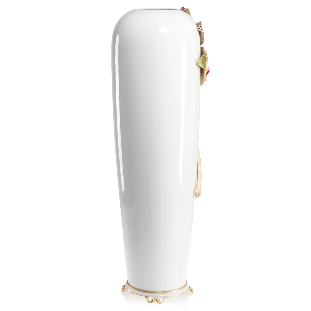 Pewter with a 14K gold finish, hand-enameled and hand-set with Swarovski® crystals at the Jay Strongwater Rhode Island workshop. Tall ceramic vase with creamy white crackle finish from Portugal.