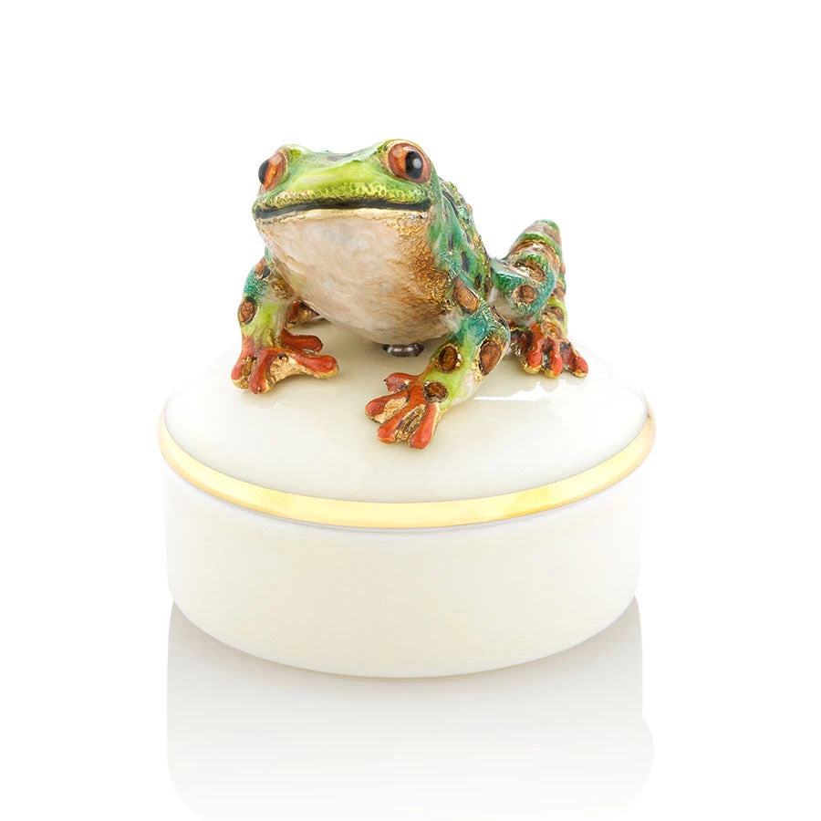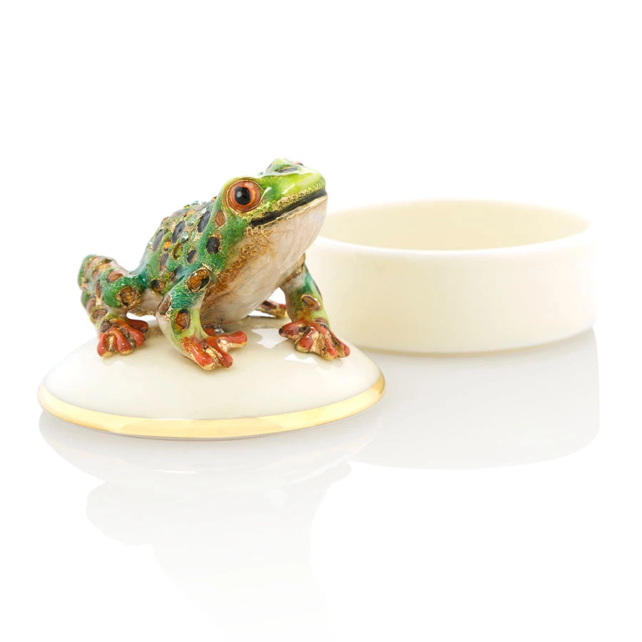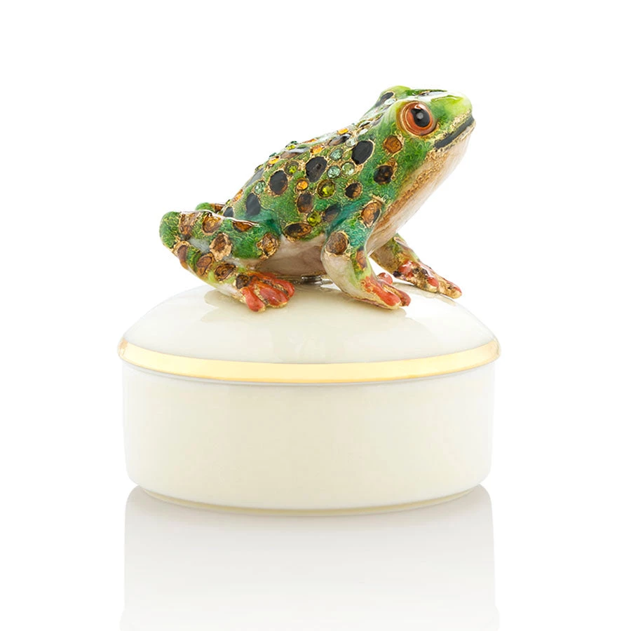 It looks like Mac the frog is about to jump right off his cream porcelain box. He is expertly spotted and stripped in hand applied topaz enamels and crystals against his bright green body. Perfect keepsake box that never fails to charm and delight!
