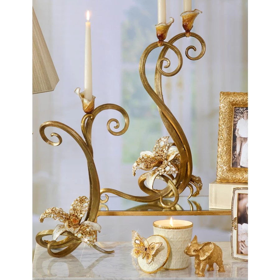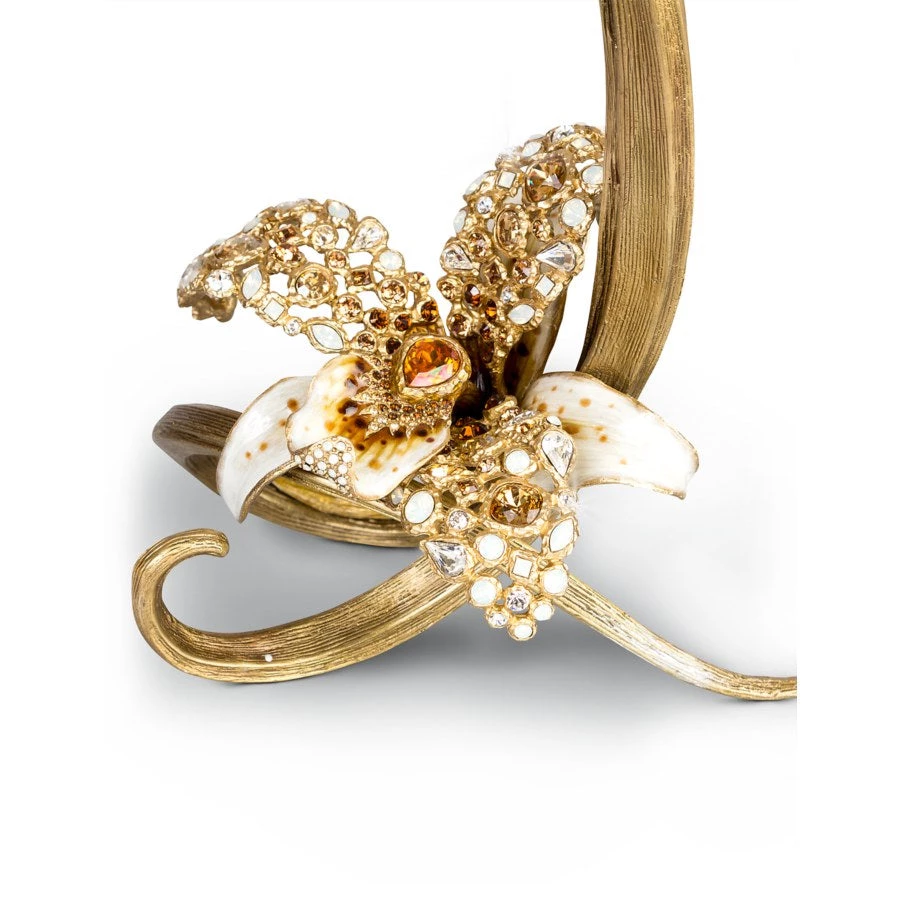 A striking contour of nouveau-style scrolled brass rises from the table, holding leaf-shaped candle cup. At the base of our Mirabelle Orchid Single Candlestick, a lush orchid is fully bloomed in golden-toned enamels and set with vibrant faceted Swarovski® crystals in shades of Champagne Topaz. Our finest artisans at the Jay Strongwater Rhode Island workshop bring all the elements together to make each candlestick. Beautiful displayed as a pair, or individually.