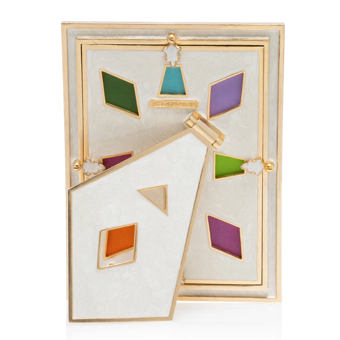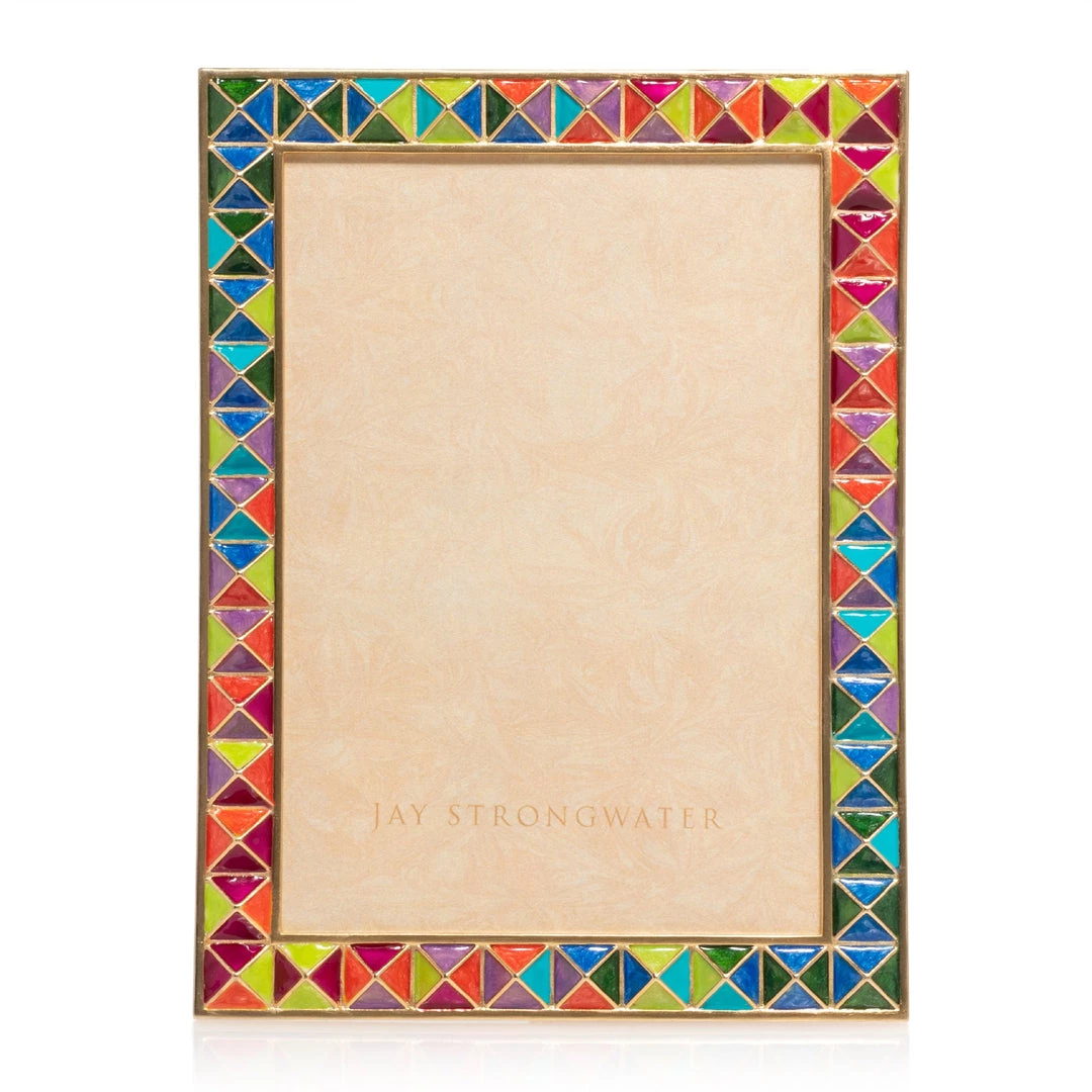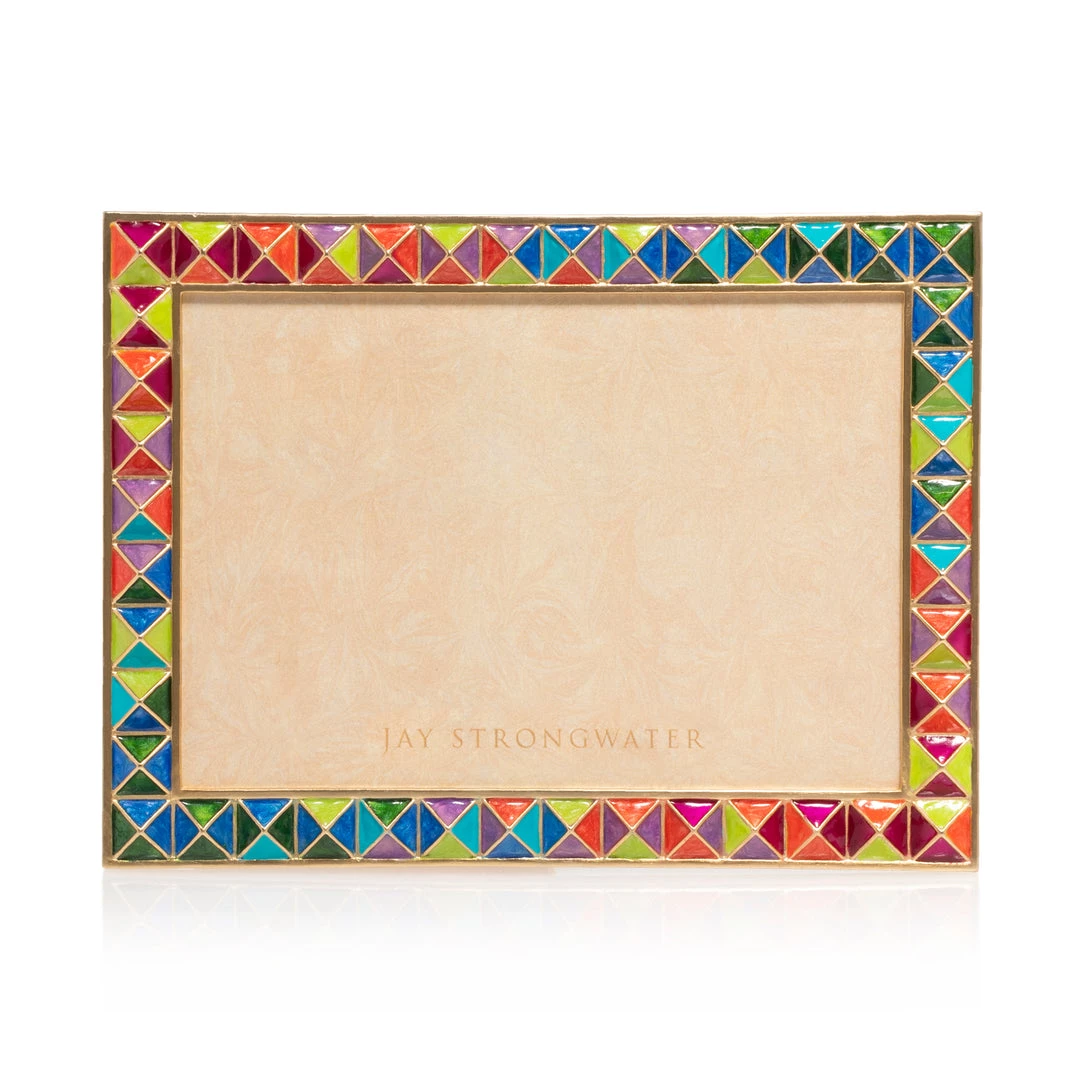 Gleaming rows of polished faceted metal pyramids – enameled in a brilliant kaleidoscope of overlapping colors that ombre around the border – define the Vertex Pyramid 5” x 7” Frame with a sleek modern sheen. Front, back and kickstand formed by pouring molten pewter into molds, hand polishing and then finishing in 14K gold. Each pyramid’s facets hand-painted in a crisp jewel bright enamels by our finest artisans at the Jay Strongwater Rhode Island workshop. With our signature enamel metal back plate and kickstand – this frame is truly beautiful from any view. Frame stands vertically or horizontally.