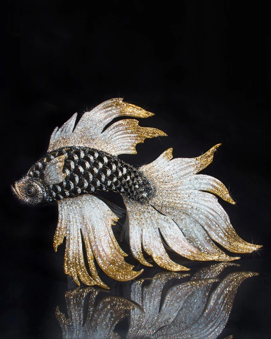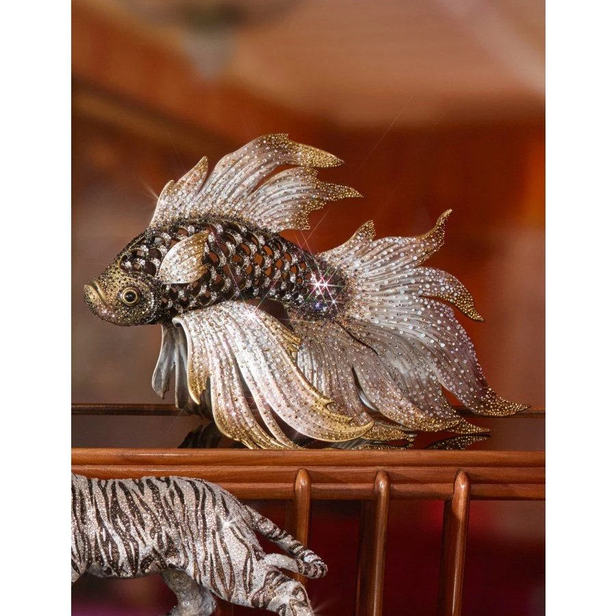 Celebrating 20 years of fabulousness! In 2015, Jay Strongwater proudly celebrated our 20th year with a collection of five iconic designs, each in a limited edition of 20. You could almost say this collection has been 20 years in the making, as each piece encompasses all the craftsmanship, superlative materials, and dazzling beauty we are so passionate about. The exotic never fails to captivate our imagination with alluring silhouettes and striking colors. Our solid brass fish has gently rippling fins and pierced scales, hand-painted in sheer enamels in ombré tones of gray moonstone, pearl, and gold, and shimmering with more than 13,000 Swarovski® crystals in black diamond, opal, jet, and gold aurum hues. The brass is poured in India, then enameled and hand-set with crystals in the Jay Strongwater Rhode Island workshop.