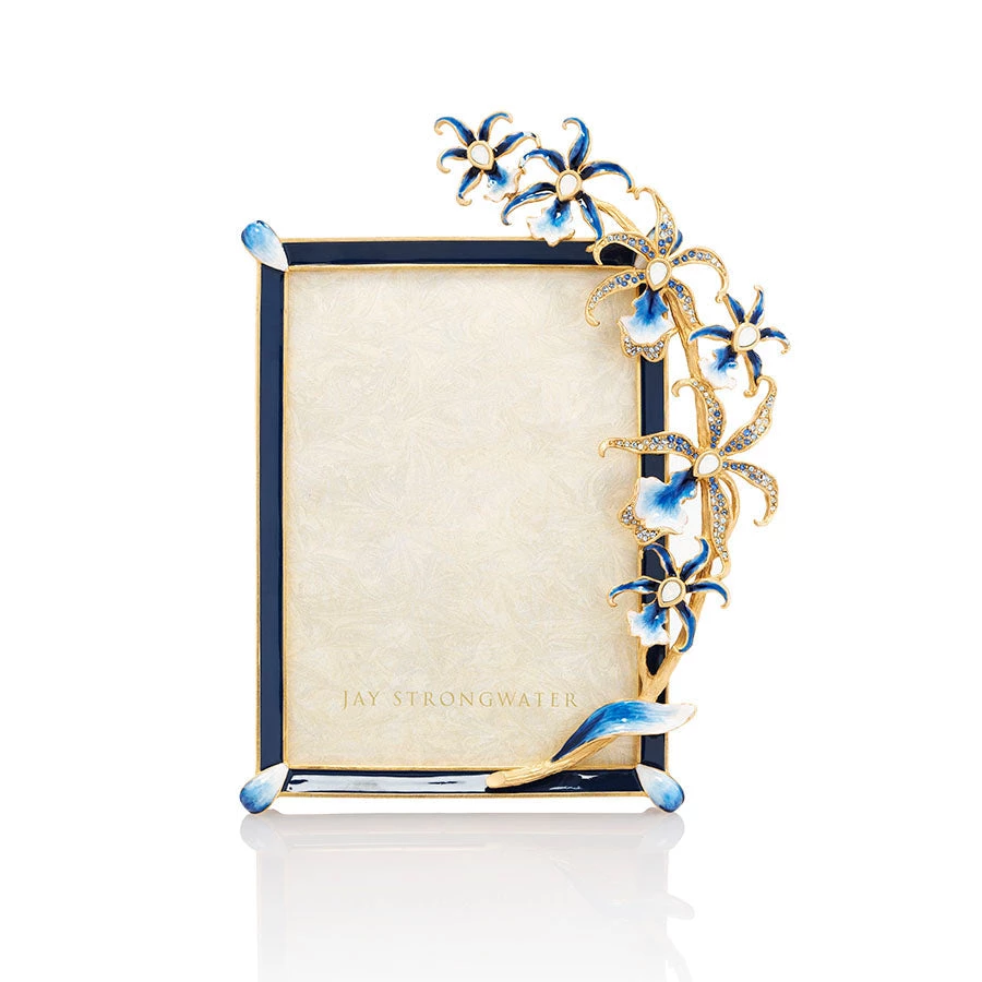 Inspired by painted orchid flowers found on navy and white Chinese porcelains, we have carved a delicate branch of orchids gently swaying over the Natalie frame. Some petals shaded in hand-painted cream to cobalt enamels while others are fully hand-set with crystals and set against the translucent navy enameled frame. With our signature, enameled metal back plate and kickstand – this frame is truly beautiful from any view. Natalie Orchid 5”x7” Frame stands vertically or horizontally. Masterfully crafted at the Jay Strongwater Rhode Island workshop.