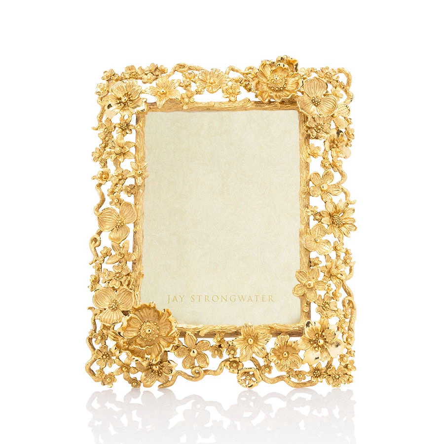 In the Composition collection, we set aside our enamels and crystals allowing the natural beauty of the carved metals to shine through. An exuberant bouquet of flowers strewn around the Ophelia frame, each one engraved by our master artisans with textures and hand-polished highlights. Casted in pewter and finished in 18K gold at our Rhode Island workshop. This Ophelia frame is complete with a mahogany finished wood back plate and kick stand allowing it to stand vertically or horizontally.