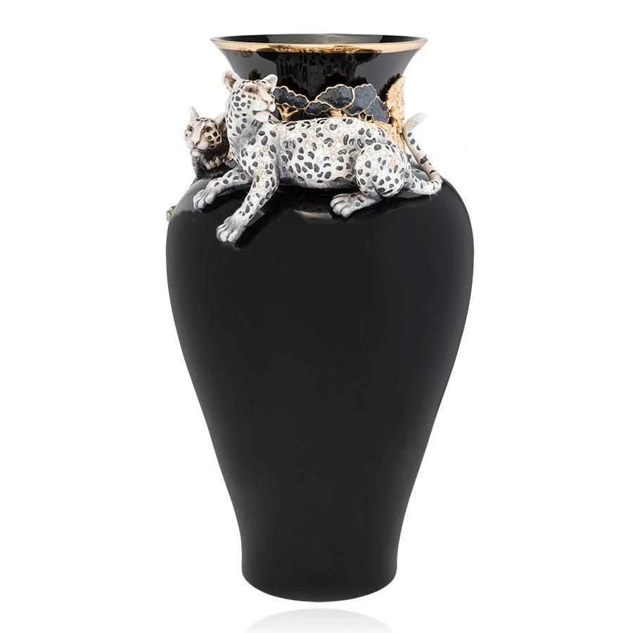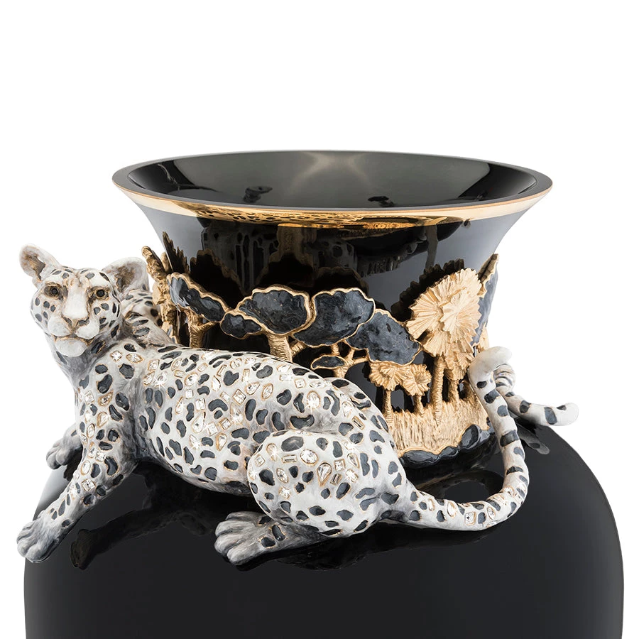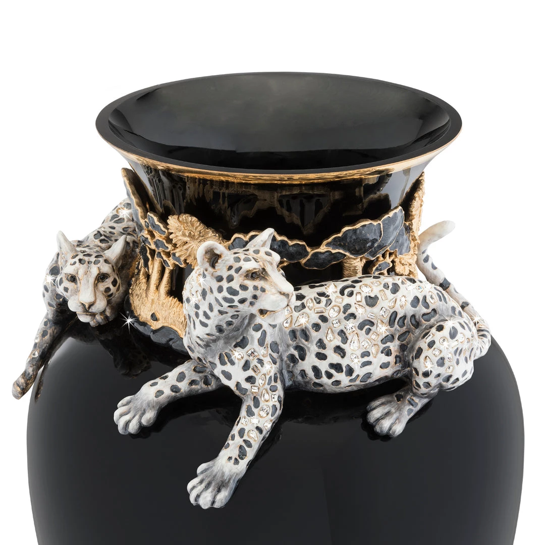 Glass vase with metal leopards in a 18KT. Gold, light brown antique finish. Hand enameled and stoned in New York with glass from Portugal.
