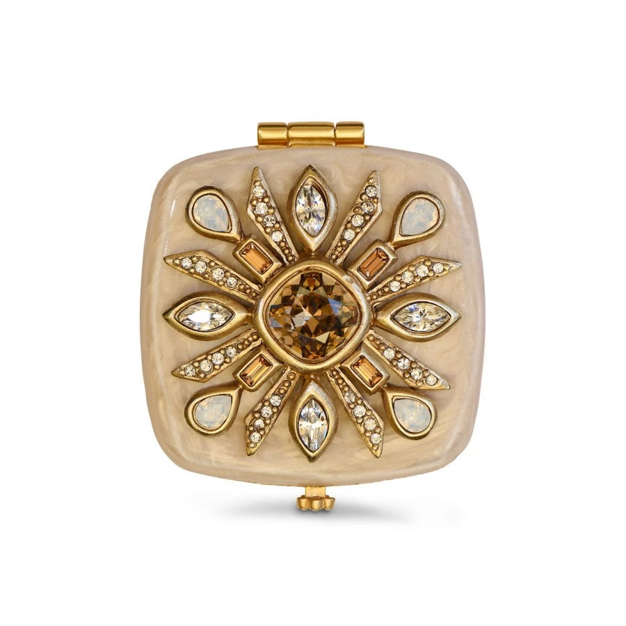 A pretty little accessory. The Schuyler Maltese Bejeweled Compact is made with faceted, hand-set cushion, pear, and marquis-cut crystal stones in silk, opal, and topaz hues.